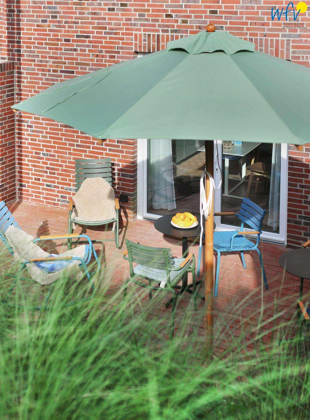 Die 13 m² große Terrasse mit Liegestühlen und Sonnenschirm lädt zu ausgiebiger Erholung ein. Hier können Sie mit Blick ins Grüne die Seele baumeln lassen, die Sonne genießen oder bei einem guten Glas Wein die Abendröte beobachten.