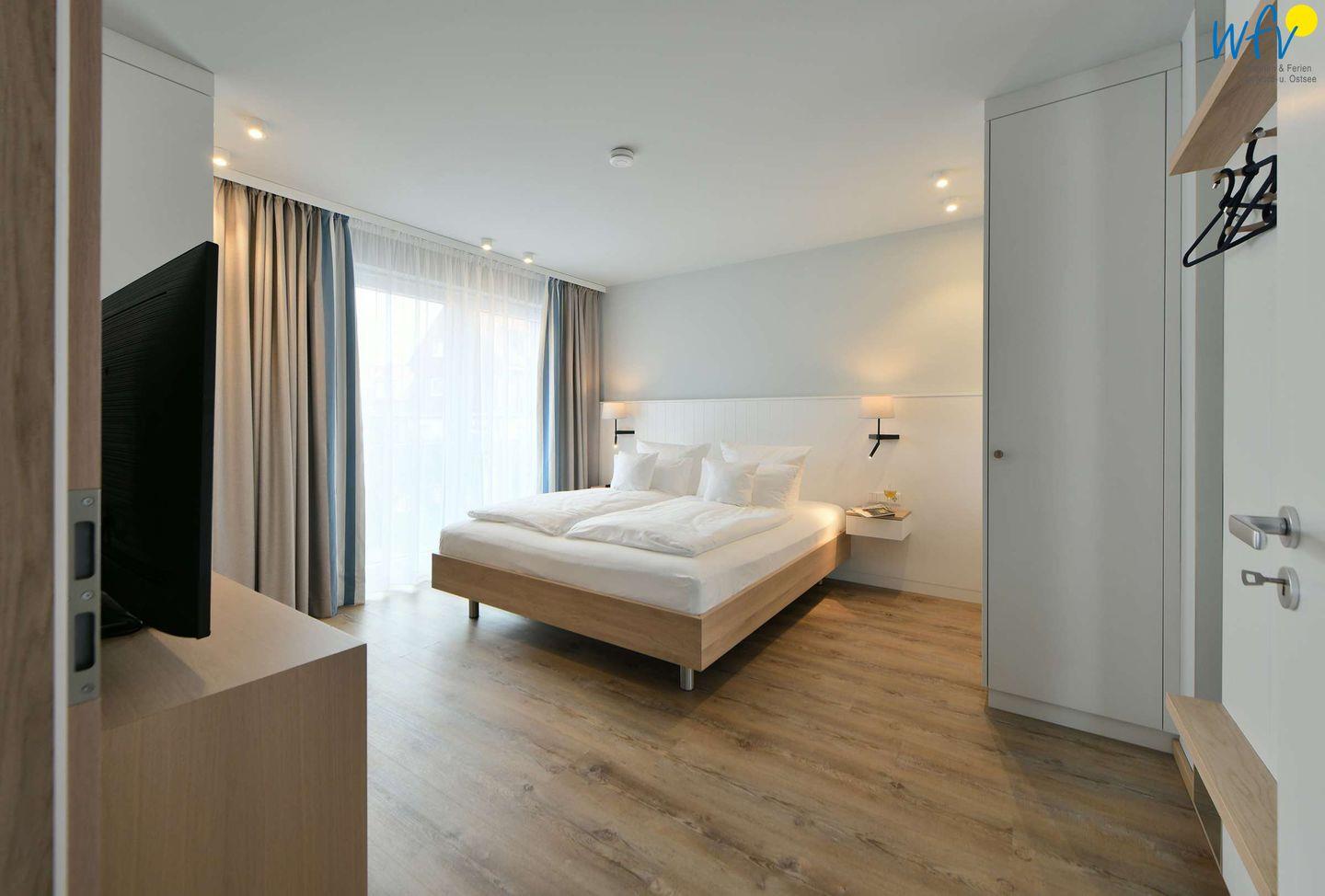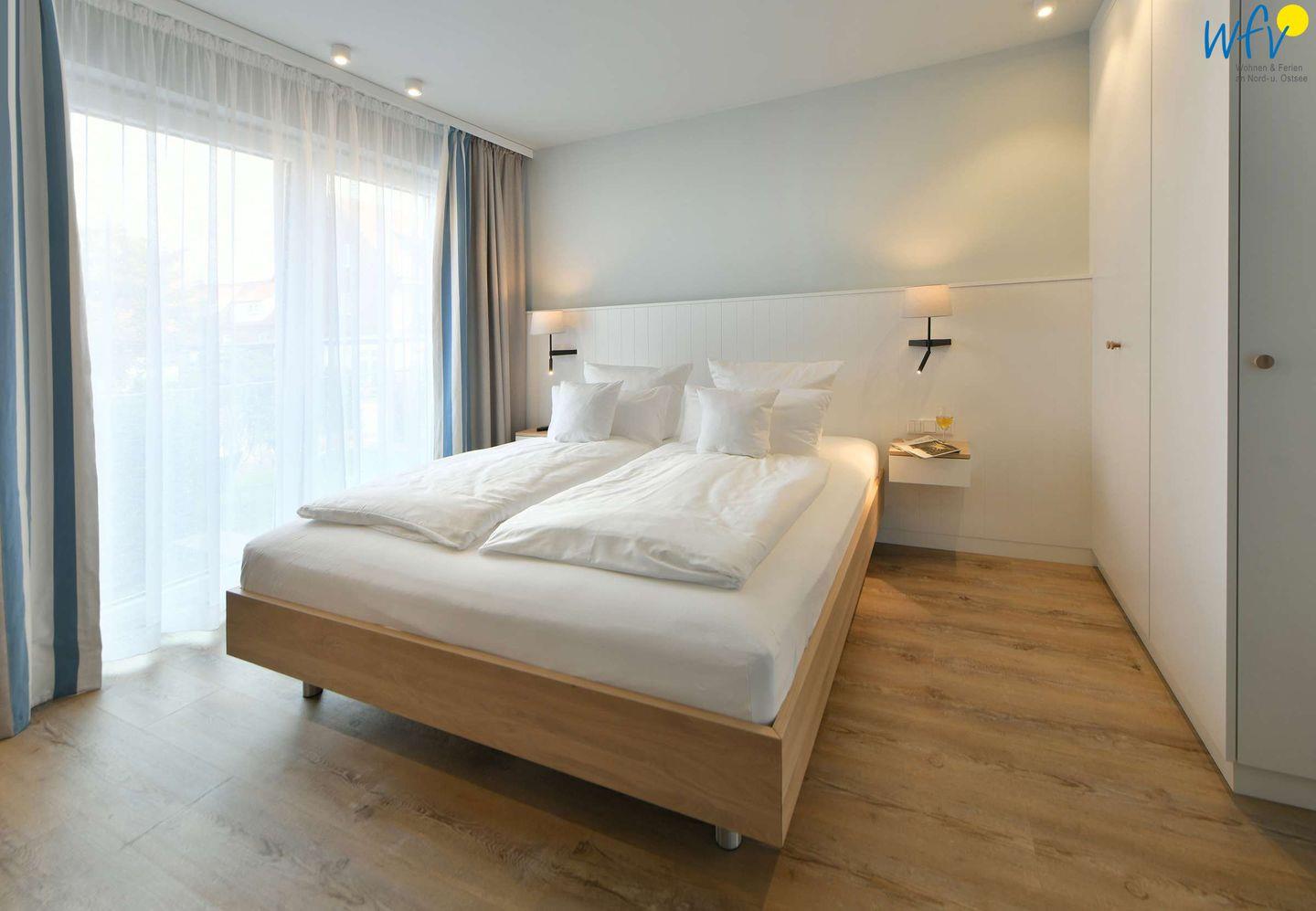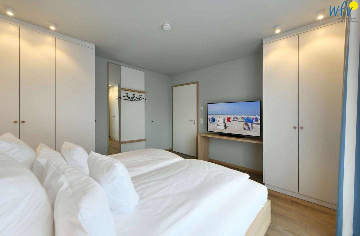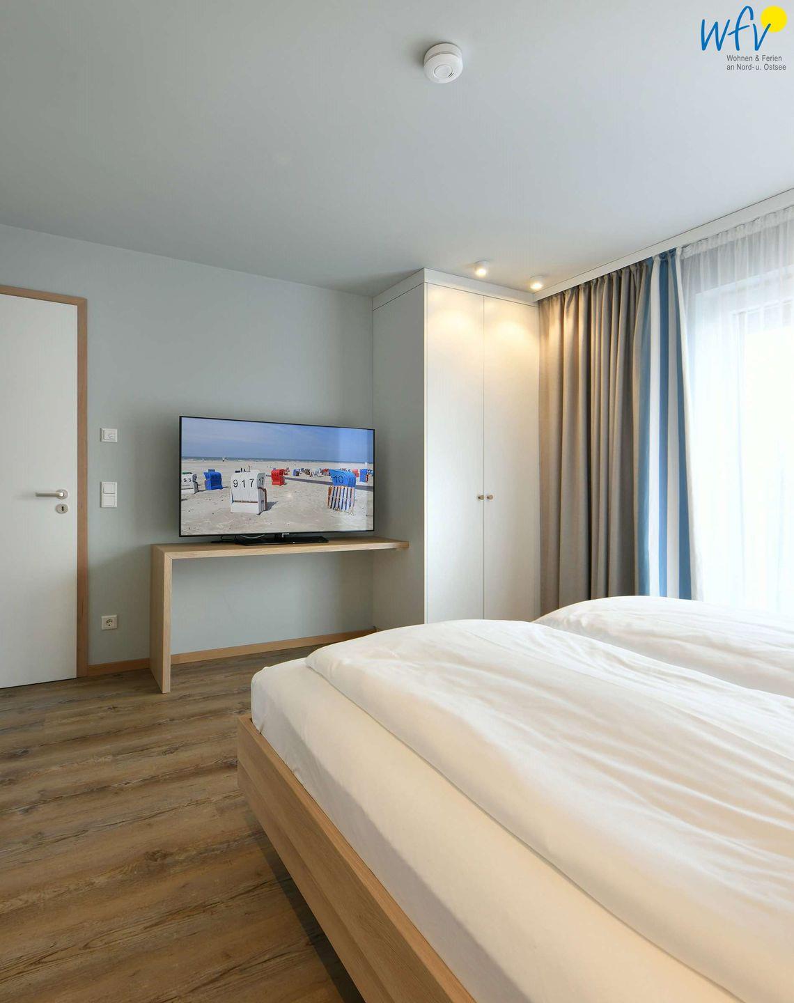 Das separate Schlafzimmer der Ferienwohnung auf Juist ist mit einem Doppelbett mit hochwertigen Matratzen (210 x 180 cm; exklusives SCHRAMM-Bettsystem plus Topper), einem Kleiderschrank und einem zusätzlichen SmartTV mit WLAN-Anschluss ausgestattet. Es bestehen gute Verdunkelungsmöglichkeiten. Zwei weitere Schlafplätze befinden sich im Wohnzimmer auf einer gemütlichen Schlafcouch.