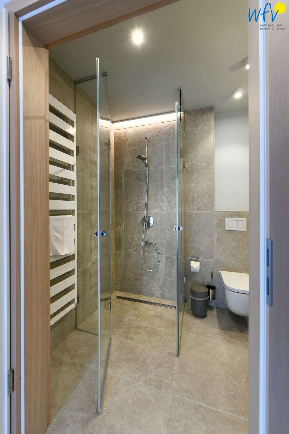 Wohnkomfort bietet Ihnen auch das moderne Badezimmer mit stilvoller Ausstattung und einer großen, bodentiefen Dusche.