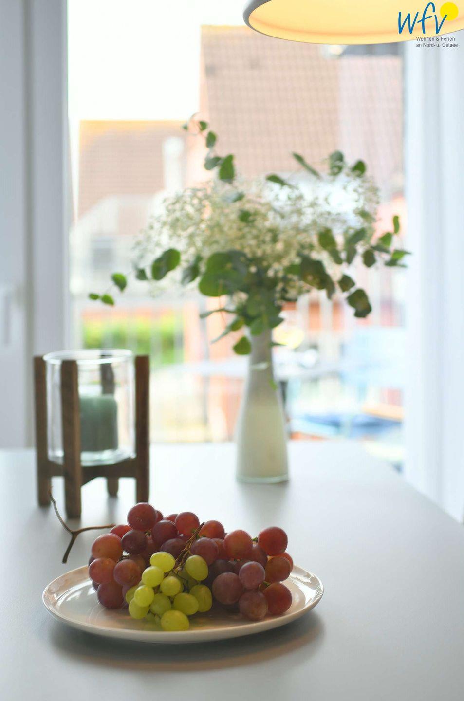 Für eine bequeme Selbstverpflegung ist die Ferienwohnung "Bill" mit einer gut bestückten Einbauküche ausgestattet – u.a. mit Herd, Backofen und Spülmaschine. Zusätzlich zur Filterkaffee-Maschine ist eine NESPRESSO vorhanden. Für gemeinsame Mahlzeiten wurde ein schöner Essbereich am Fenster eingerichtet.