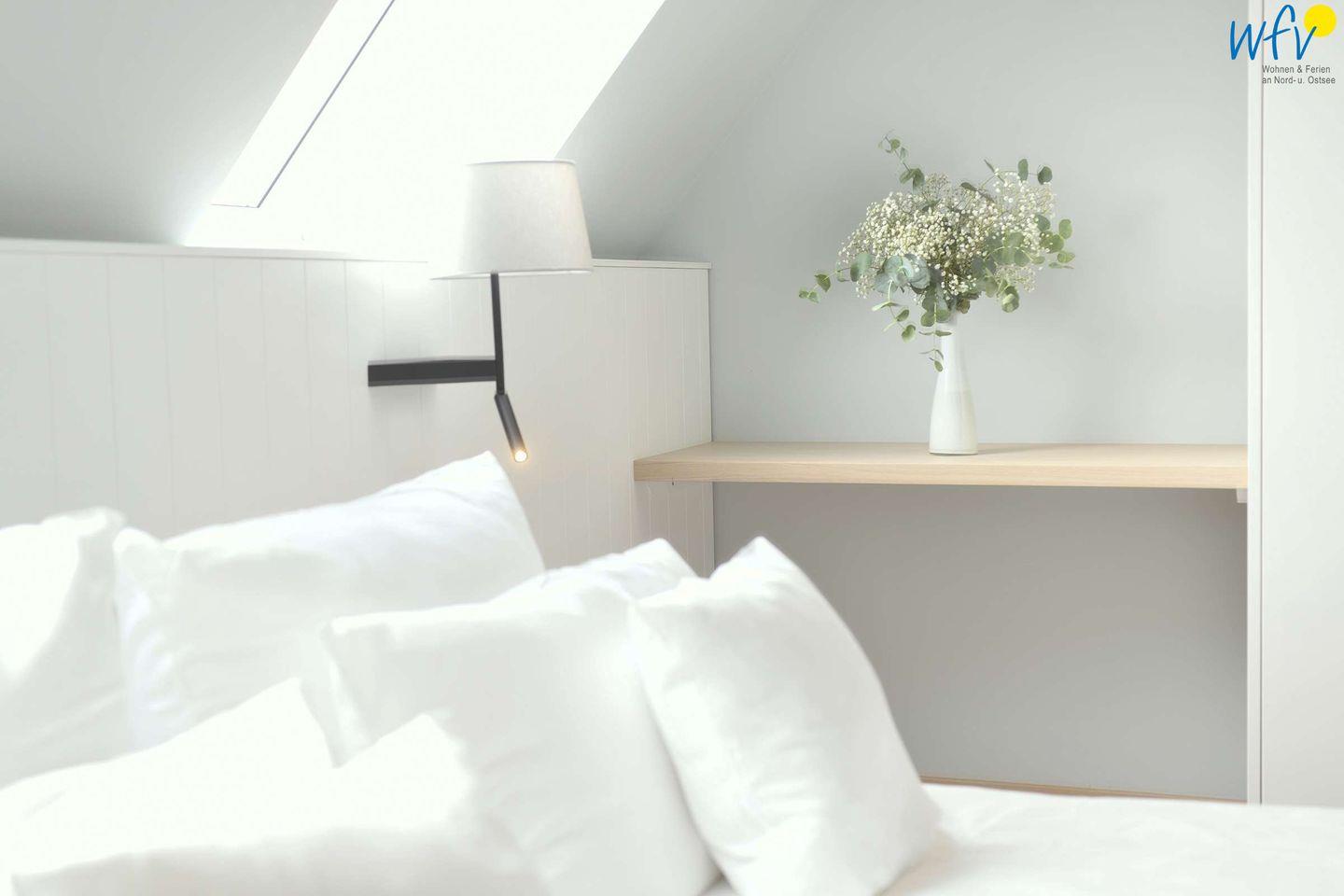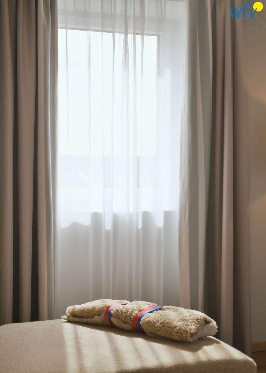 Ein gehobener Stil erwartet Sie auch in dem separaten Schlafzimmer der Ferienwohnung "Bill" auf Juist. Es verfügt über ein komfortables Doppelbett mit hochwertigen Matratzen (210 x 200 cm; exklusives SCHRAMM-Bettsystem plus Topper), einen Kleiderschrank und ein SmartTV mit WLAN-Anschluss. Der Raum kann gut verdunkelt werden. Zwei zusätzliche Schlafmöglichkeiten befinden sich im Wohnzimmer auf einer gemütlichen Schlafcouch.