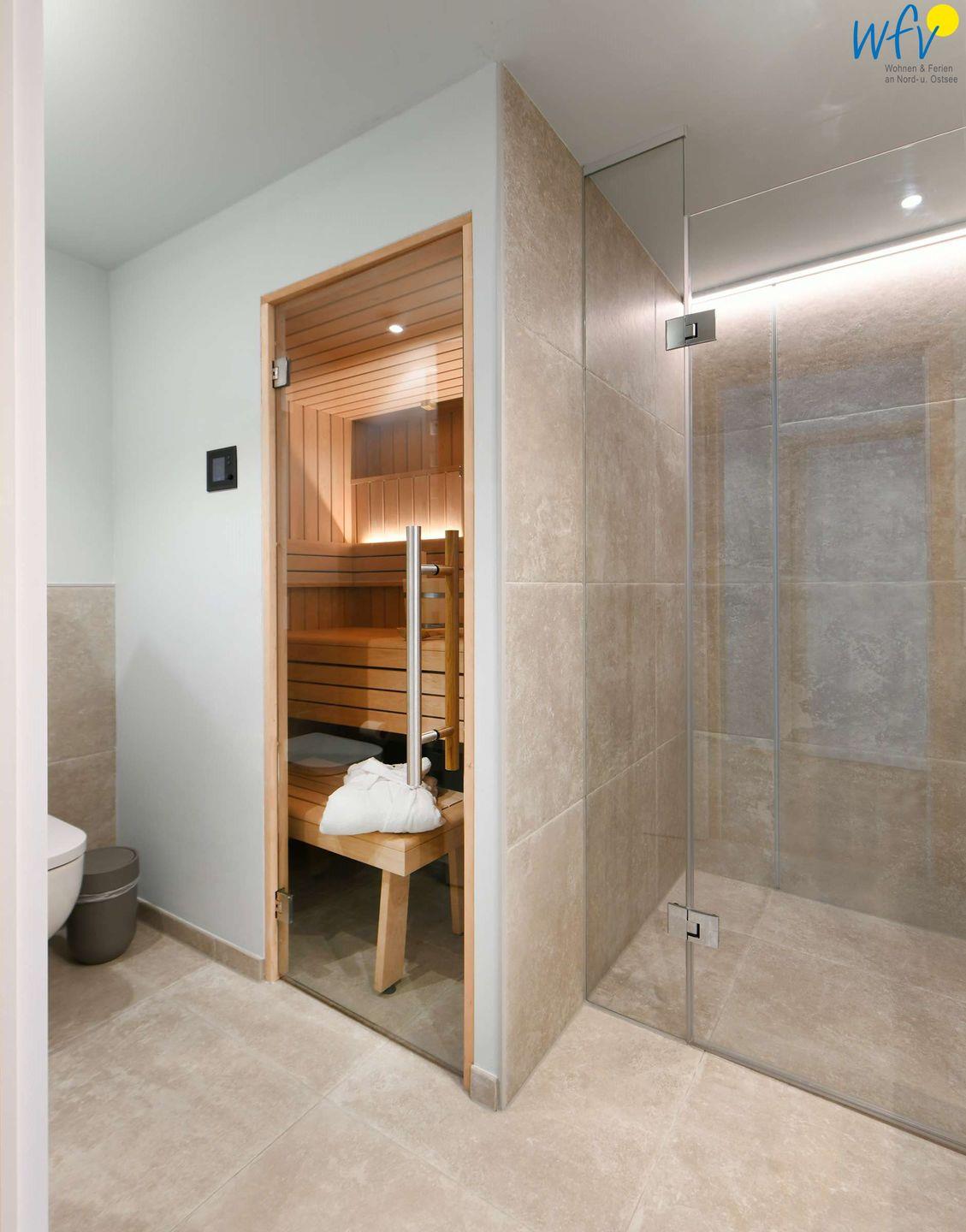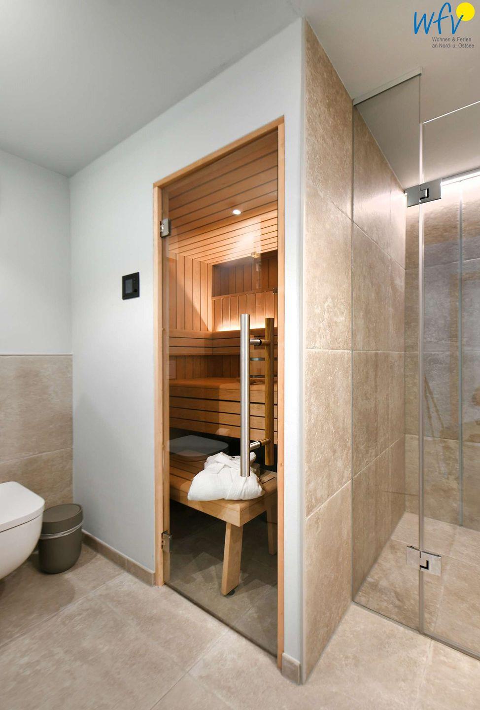 Weiteren Wohnkomfort bietet Ihnen das moderne Badezimmer mit stilvoller Ausstattung, Dusche und eigener Sauna. Ideal für Entspannungsmomente nach dem Strandspaziergang!