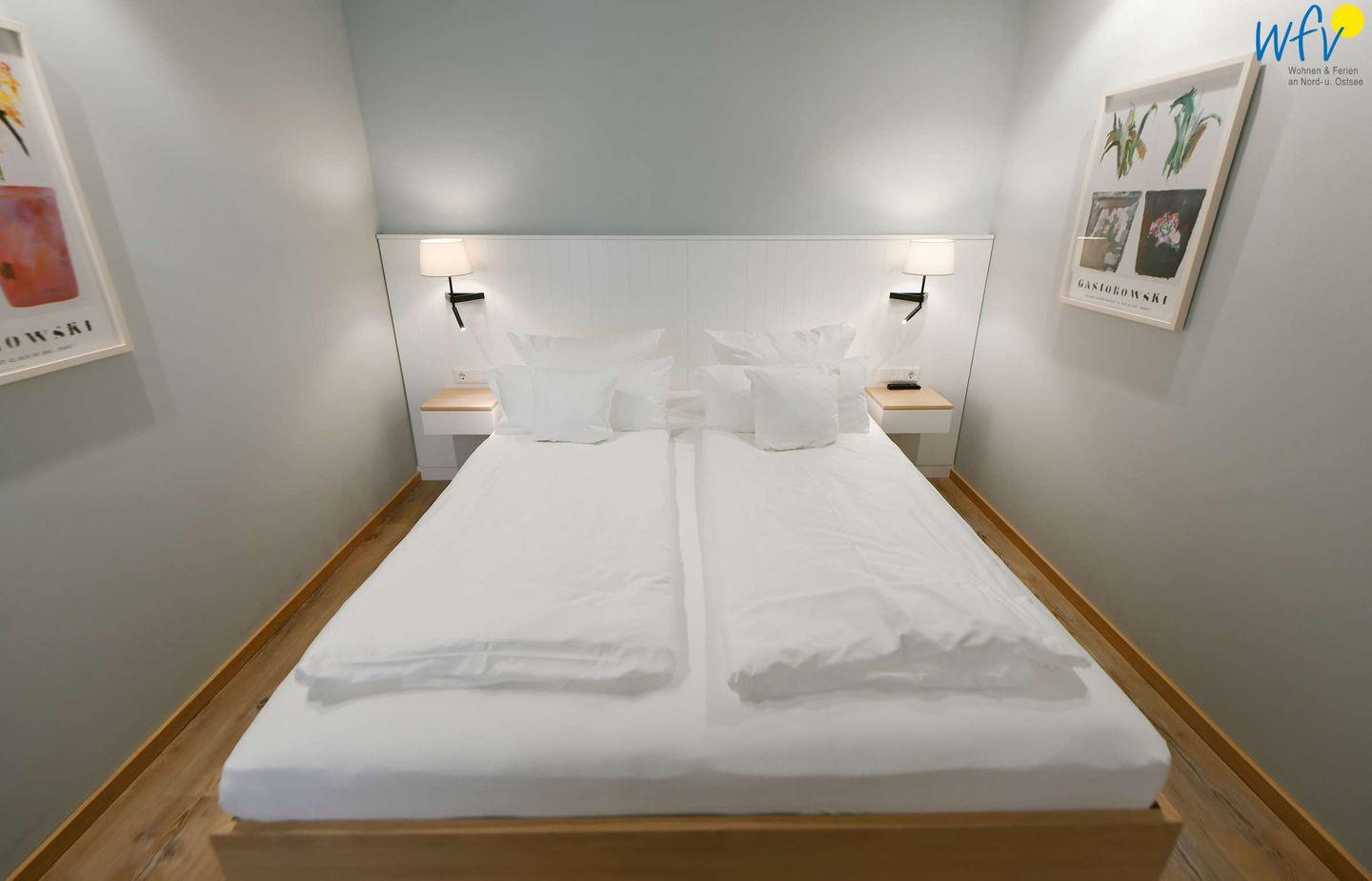 Ein gehobener Stil erwartet Sie auch in den separaten Schlafzimmern der Ferienwohnungen "Seestern" und "Segel" auf Juist! Sie sind mit einem komfortablen Doppelbett mit hochwertigen Matratzen (210 x 200 cm; exklusives SCHRAMM-Bettsystem plus Topper), einem Kleiderschrank und einem SmartTV mit WLAN-Anschluss ausgestattet. Es bestehen gute Verdunkelungsmöglichkeiten. Vier zusätzliche Schlafplätze befinden sich jeweils in den Wohnzimmern auf einer gemütlichen Schlafcouch.