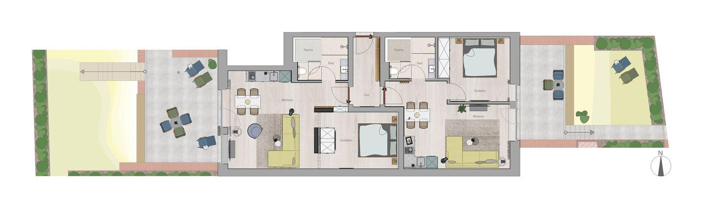 In unseren komfortablen Ferienwohnungen "Segel" und "Seestern" mit stilvollem Mobiliar, sonnigen Terrassen und Sauna erwarten Sie erholsame Ferien voller Entspannung.