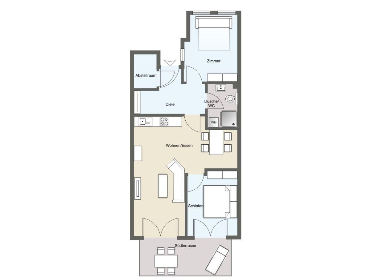 Ein geräumiger Wohnbereich mit gemütlicher Couchecke, integrierter Küche und Essbereich sowie zwei separate Schlafzimmer und ein Duschbad bieten Platz für vier Personen. Ideal für einen Urlaub mit der Familie oder mit Freunden auf Juist!