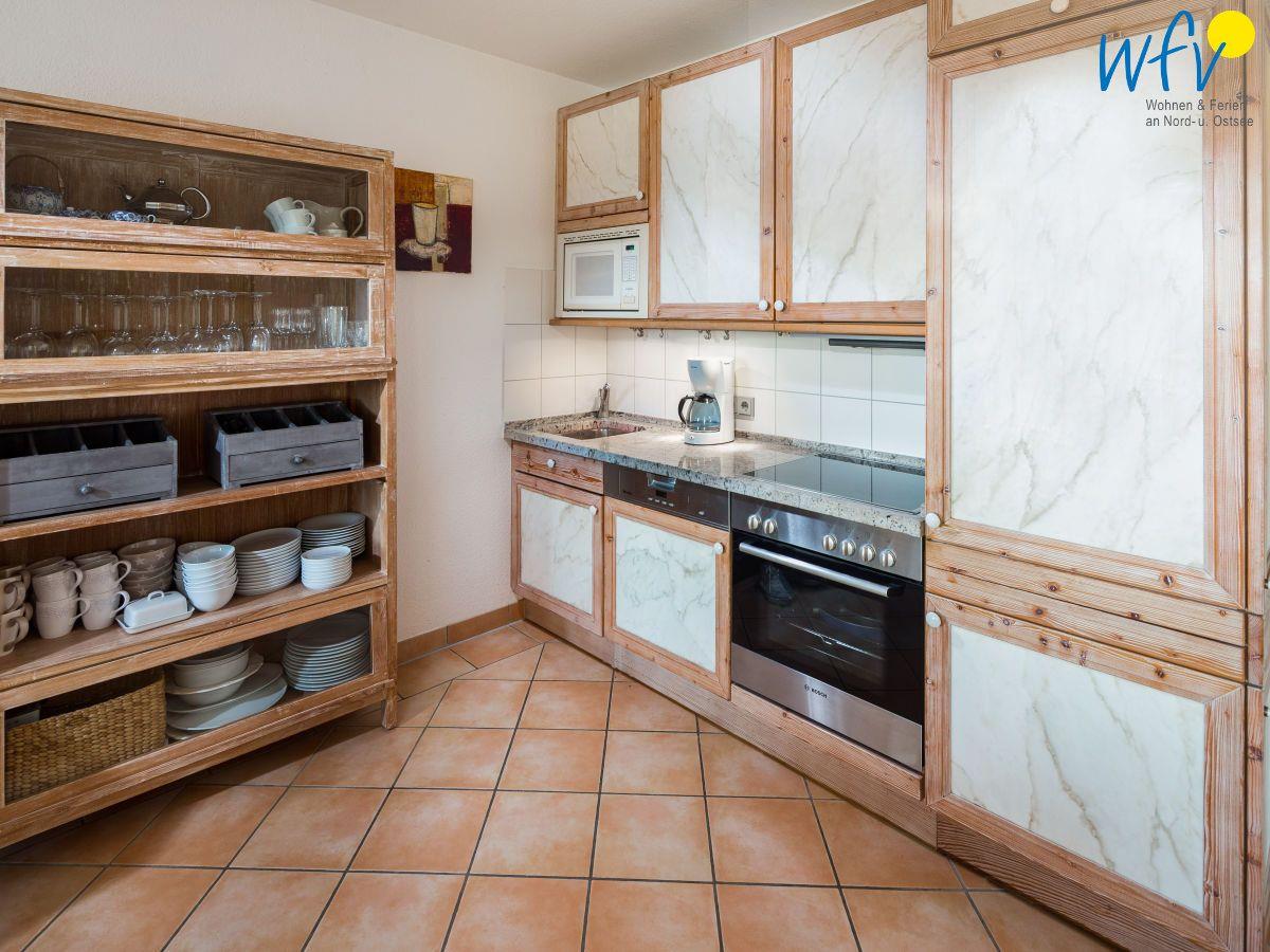 In der modernen Einbauküche lassen sich schnell und einfach leckere Gerichte zaubern. Sie verfügt u.a. über ein 4-Platten-Ceranfeld, einen Backofen, einen Kühlschrank, einen Gefrierschrank, eine Mikrowelle und eine Spülmaschine. Ebenso über eine Kaffeemaschine, einen Wasserkocher und einen Toaster.