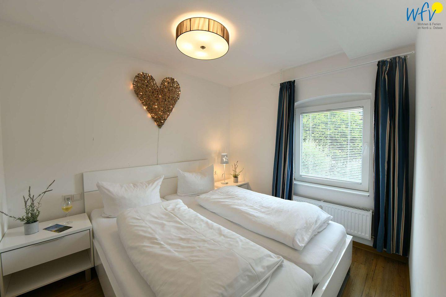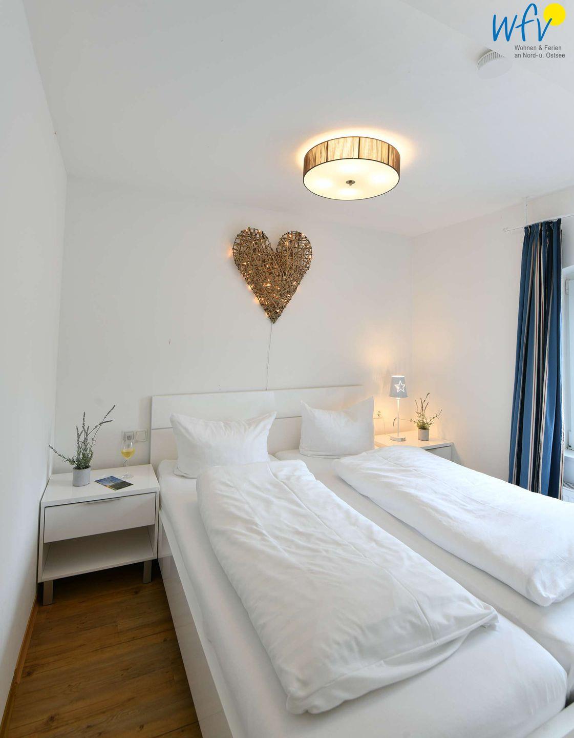 In dem separaten Schlafzimmer unserer Ferienwohnung "Sandröschen" auf Juist befindet sich ein bequemes Doppelbett (ohne Kleiderschrank). Geräumige Nachttische bieten Platz für einen Teil der Urlaubsgarderobe.