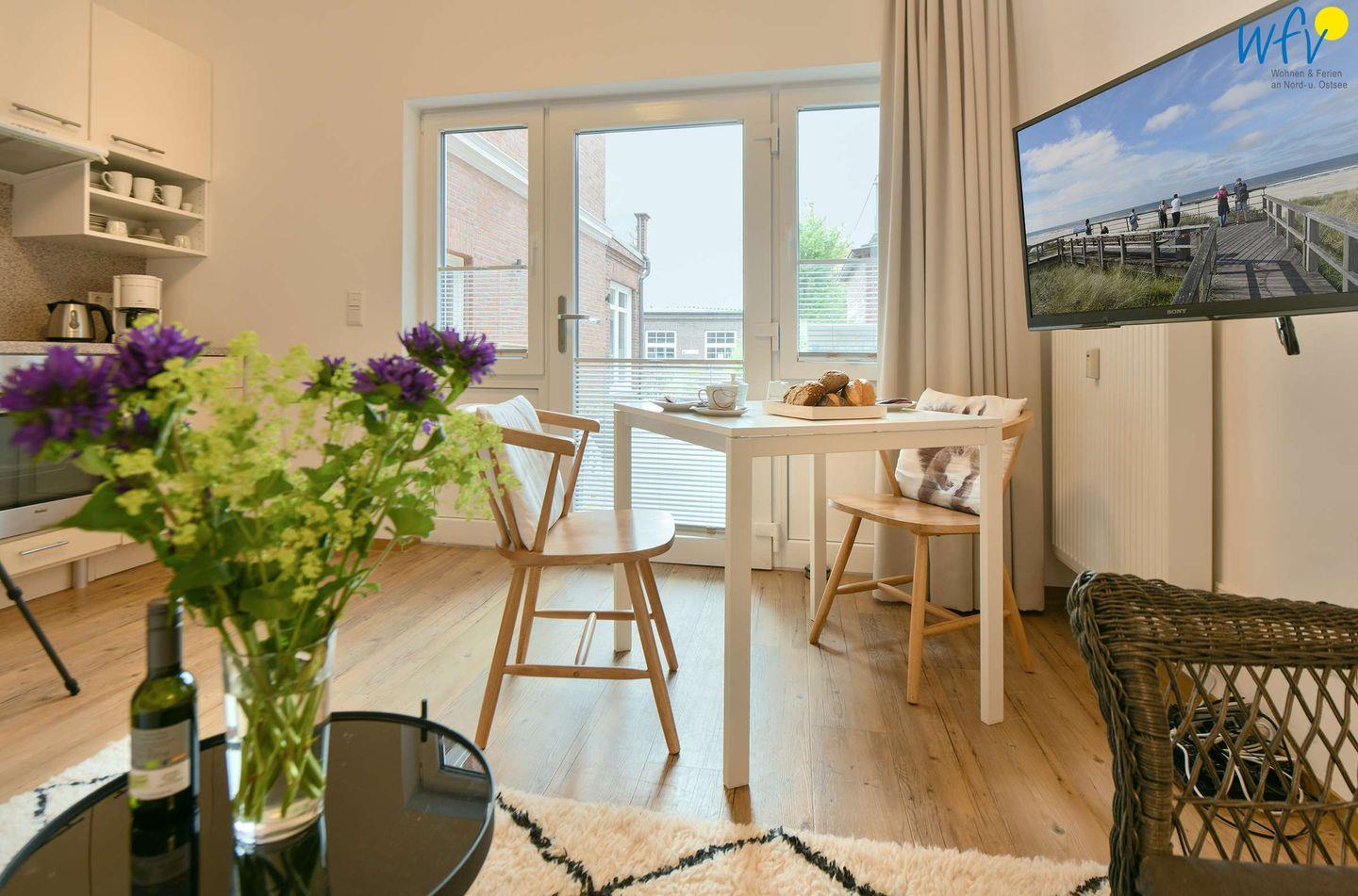 Für die praktische Selbstverpflegung ist im Wohnraum eine moderne Küchenzeile integriert - u.a. mit Herd, Backofen und Geschirrspüler sowie Kaffeemaschine, Wasserkocher, Toaster, Geschirr und Besteck (in Körben). Für den Fall, dass Sie sich in Ihrem Urlaub kulinarisch verwöhnen lassen möchten: Auf Juist finden Sie empfehlenswerte Restaurants, auf deren Terrassen mit Meerblick Sie in den Genuss köstlicher Spezialitäten der Nordseeküche kommen!