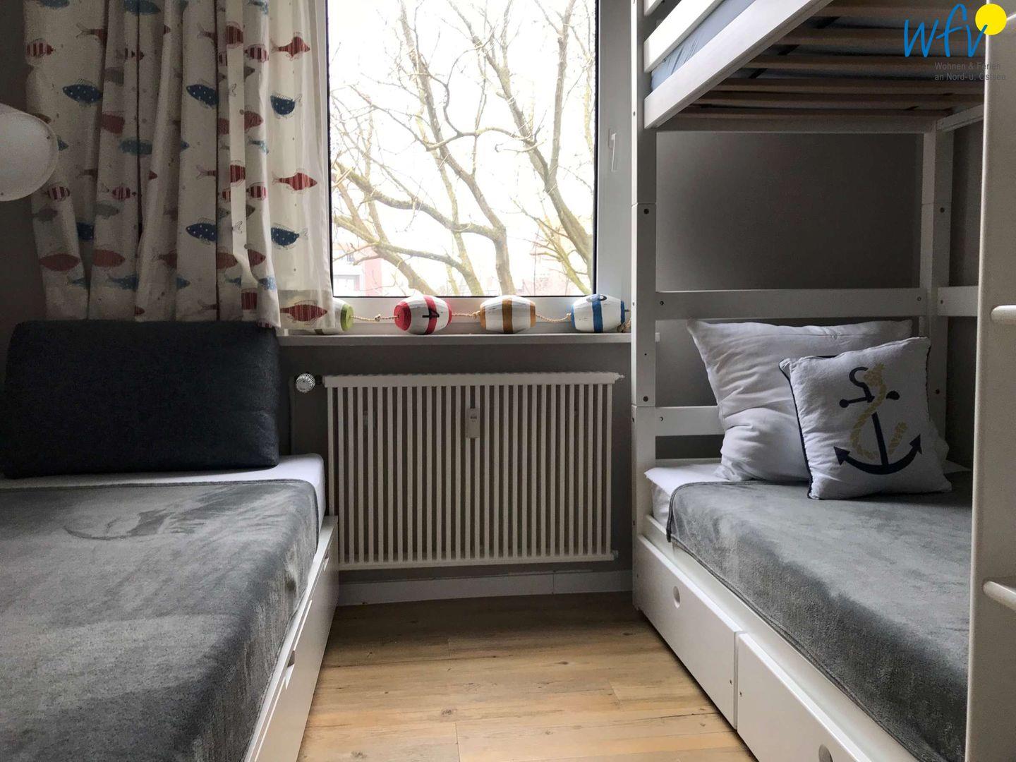 Zwei separate Schlafzimmer bieten Ihnen angenehme Rückzugsmöglichkeiten. Die Zimmer sind im Beach-House Flair mit gehobener Ausstattung eingerichtet - ein echtes Highlight! In einem der beiden Schlafzimmer befindet sich ein Doppelbett und ein Kleiderschrank sowie eine Badewanne und ein Waschbecken; direkt angrenzend ein WC. Das zweite Schlafzimmer ist mit drei Betten (einem Hochbett und einem Einzelbett) ausgestattet. Der zweite Sanitärbereich mit WC und Dusche liegt neben dem Wohnzimmer.