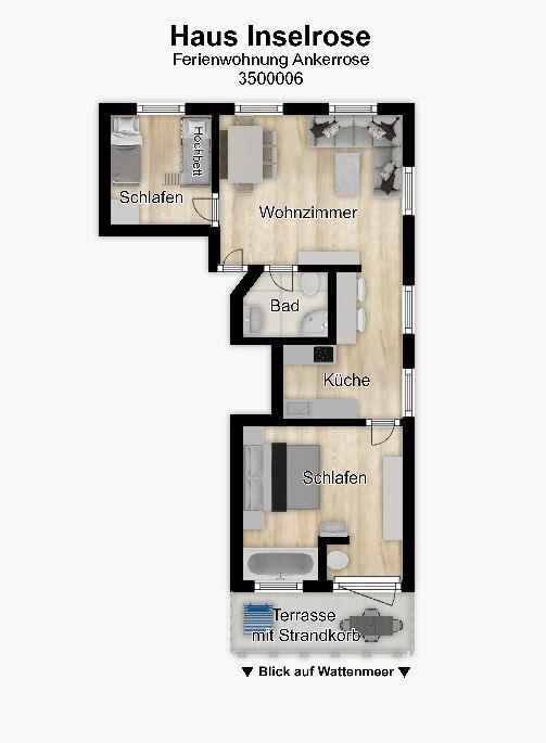 Genießen Sie Wohlfühlferien der Extra-Klasse! Mit einer komfortablen Ausstattung, zwei separaten Schlafzimmern, einem geräumigen Wohn- und Esszimmer, einer separaten Küche, zwei Sanitärbereichen und einer großen Terrasse bietet unsere Ferienwohnung "Ankerrose" auf Juist ein traumhaftes Zuhause für Ihren Urlaub mit bis zu fünf Personen!