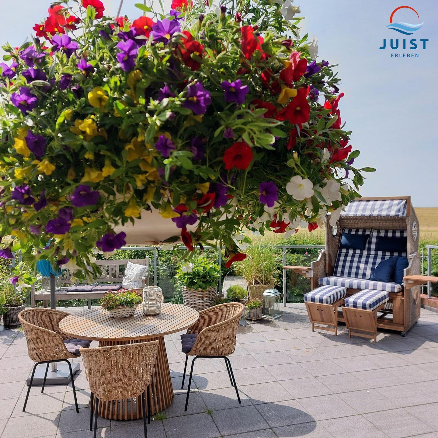 Erholsame Stunden im gemütlichen Wohnzimmer oder – bei Sonnenschein – auf der großzügigen Terrasse mit Strandkorb und schönen Pflanzen können hier voll und ganz genossen werden.