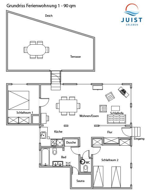 Die 92?m² große Wohnung für 3 Erwachsene und 1 Kind verfügt über einen großzügigen Wohnraum mit Couchecke, Essbereich, moderner Küche, zwei Schlafzimmer, ein Duschbad mit Badewanne, Sauna und zwei Waschbecken, ein Gäste-WC sowie eine große Süd-Terrasse.