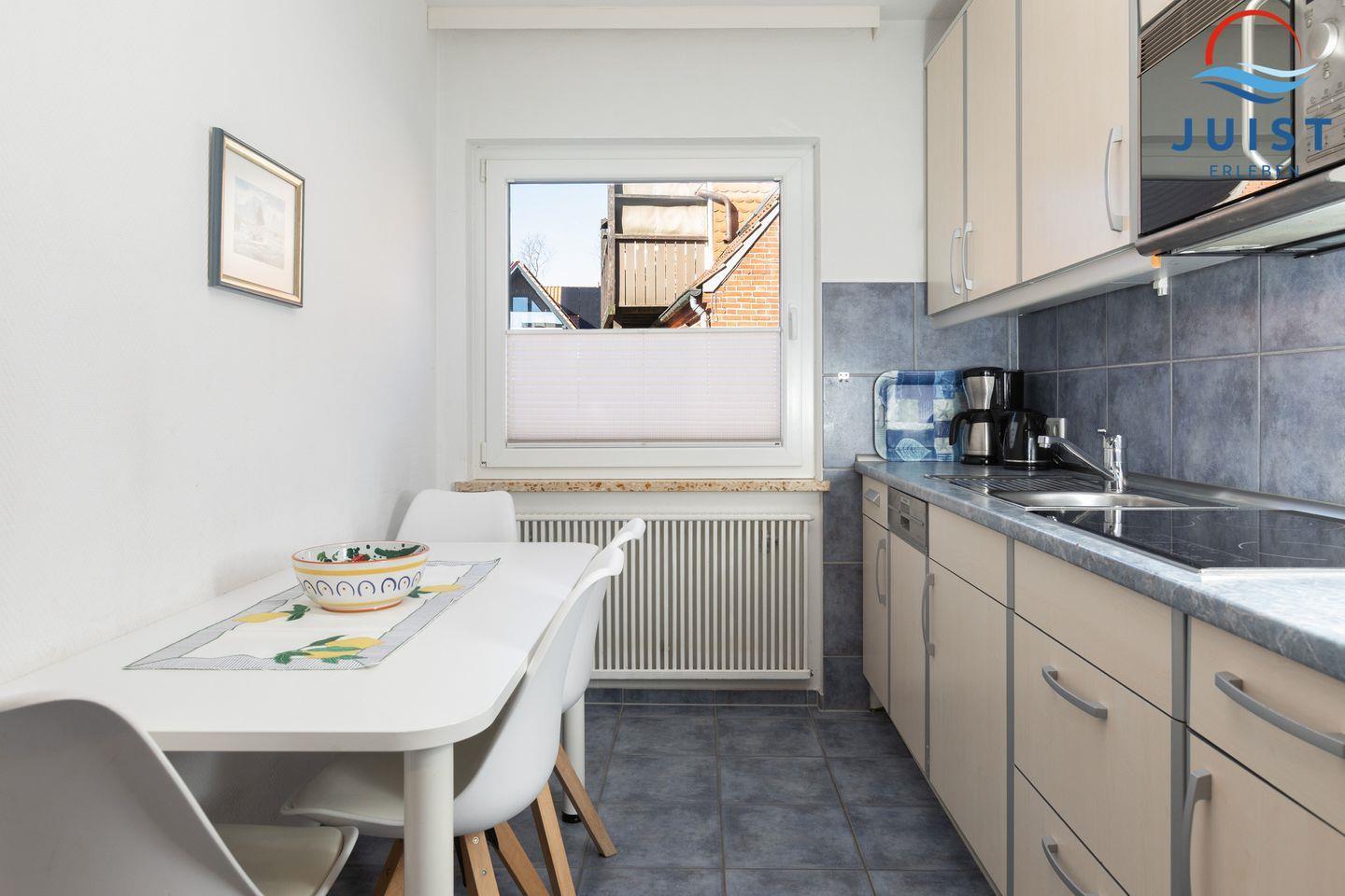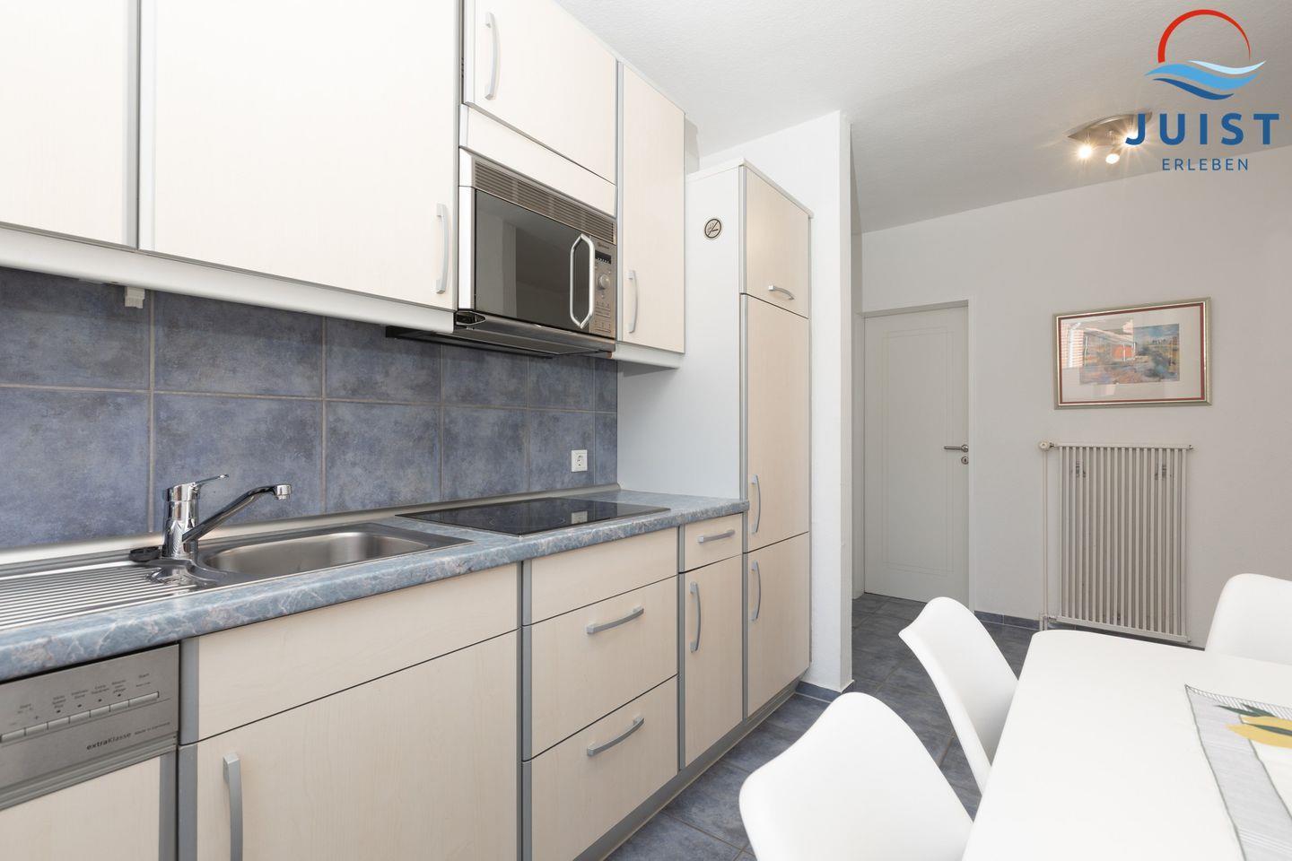 Die Küche mit Essbereich ist mit 4-Platten-Ceranfeld, Spülmaschine, Mikrowelle, Kühlschrank mit Gefrierschrank, Kaffeemaschine und Toaster ausgestattet.
