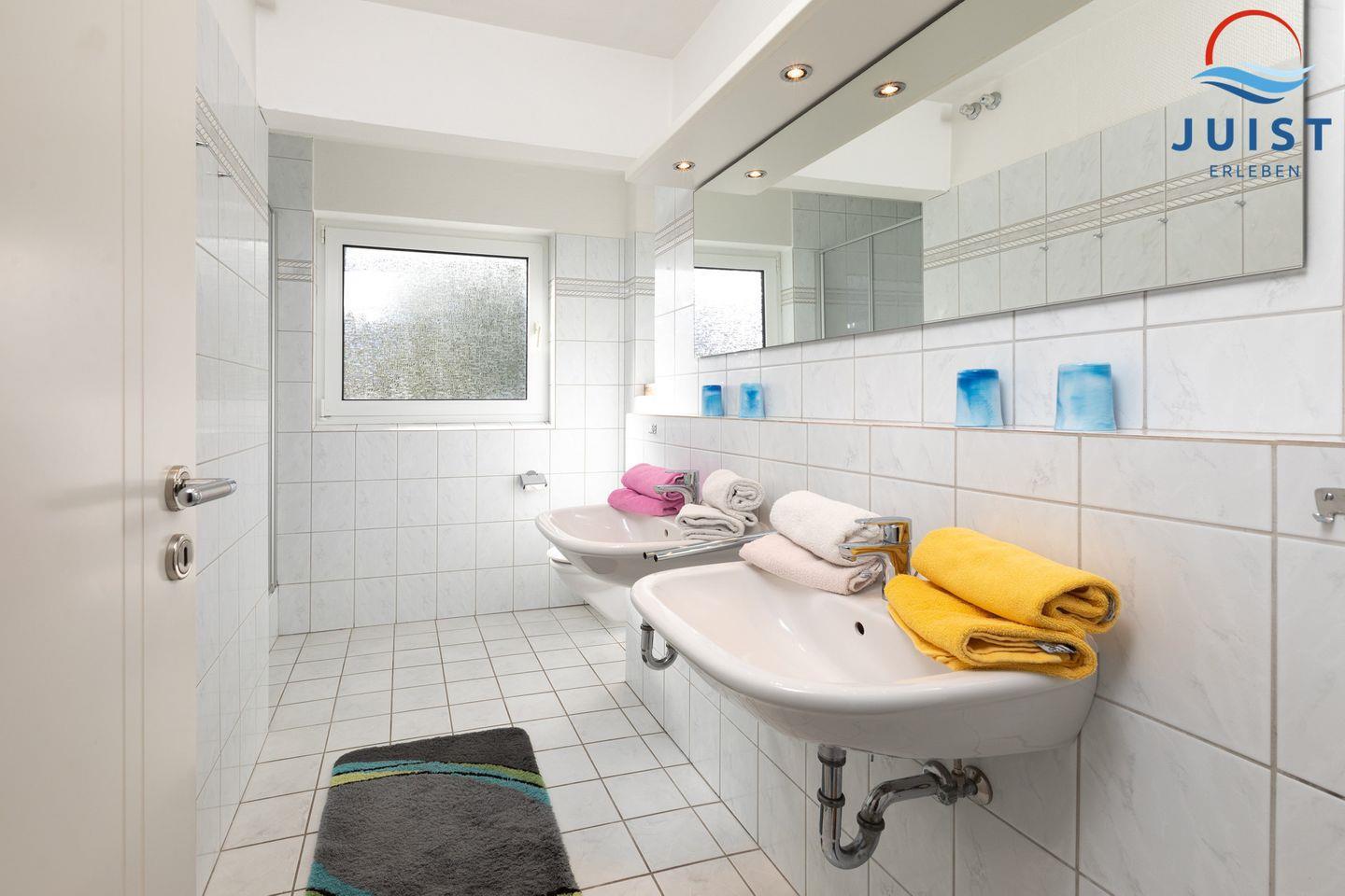 Im Badezimmer befinden sich 2 Waschbecken und eine Dusche sowie ein Fenster.