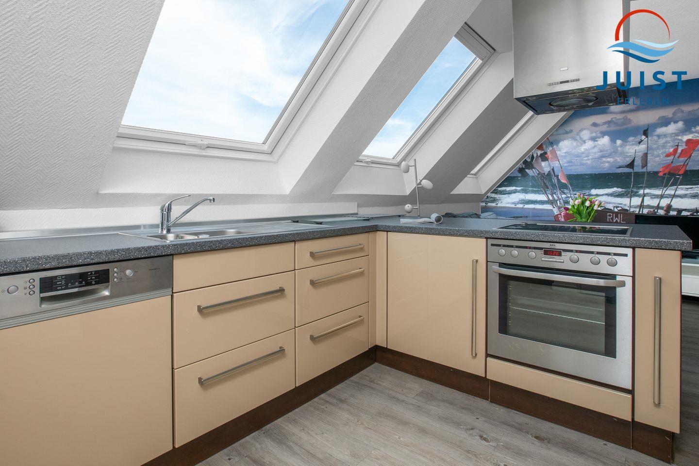 Die moderne Wohnküche verfügt über einen hellen gemütlichen Essbereich und ist mit 4-Platten-Ceranfeld, Backofen, Kühlschrank, Gefrierschrank, Kaffeemaschine sowie Toaster ausgestattet.