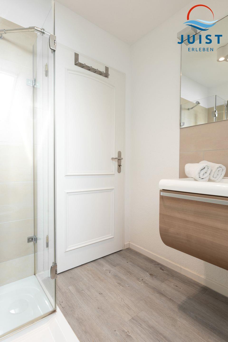 Beide modernen Badezimmer mit Dusche sind vom Flur ausgehend zugänglich.