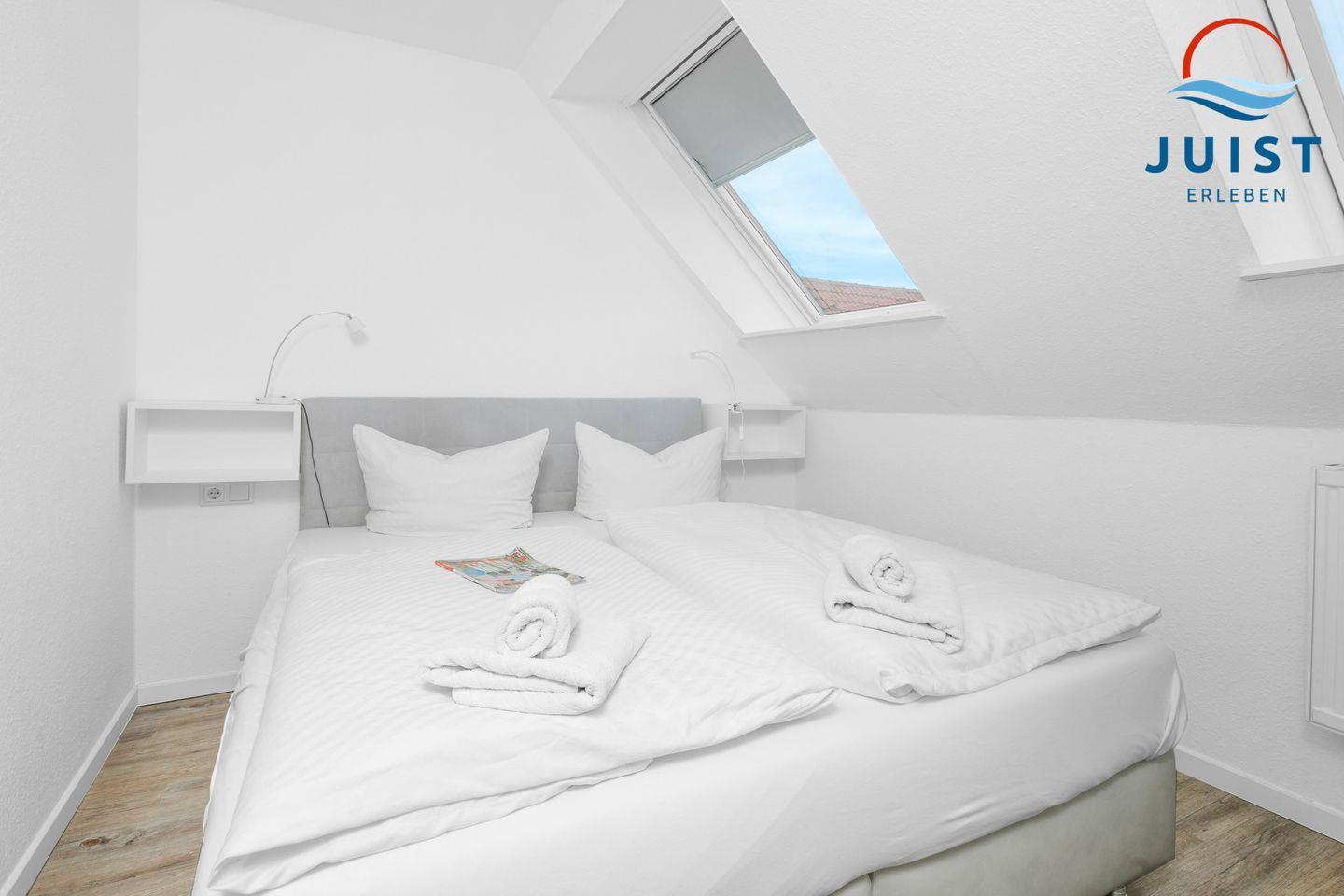 Beide Schlafzimmer sind mit einem Doppelbett sowie Kleiderschrank ausgestattet. Von einem Schlafzimmer aus haben sie einen traumhaften Blick auf den Hafen und das Wattenmeer.