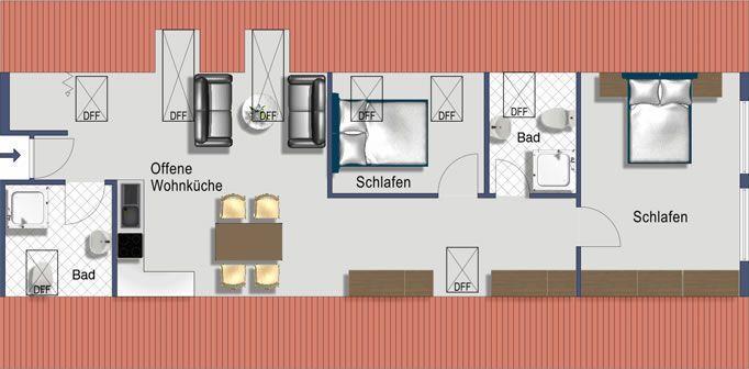 Die 75 m2 große Wohnung für 4 Personen verfügt über einen gemütlichen Wohnraum mit Couchecke, Essbereich, moderner Küche, zwei Schlafzimmer sowie zwei Badezimmer mit Dusche.