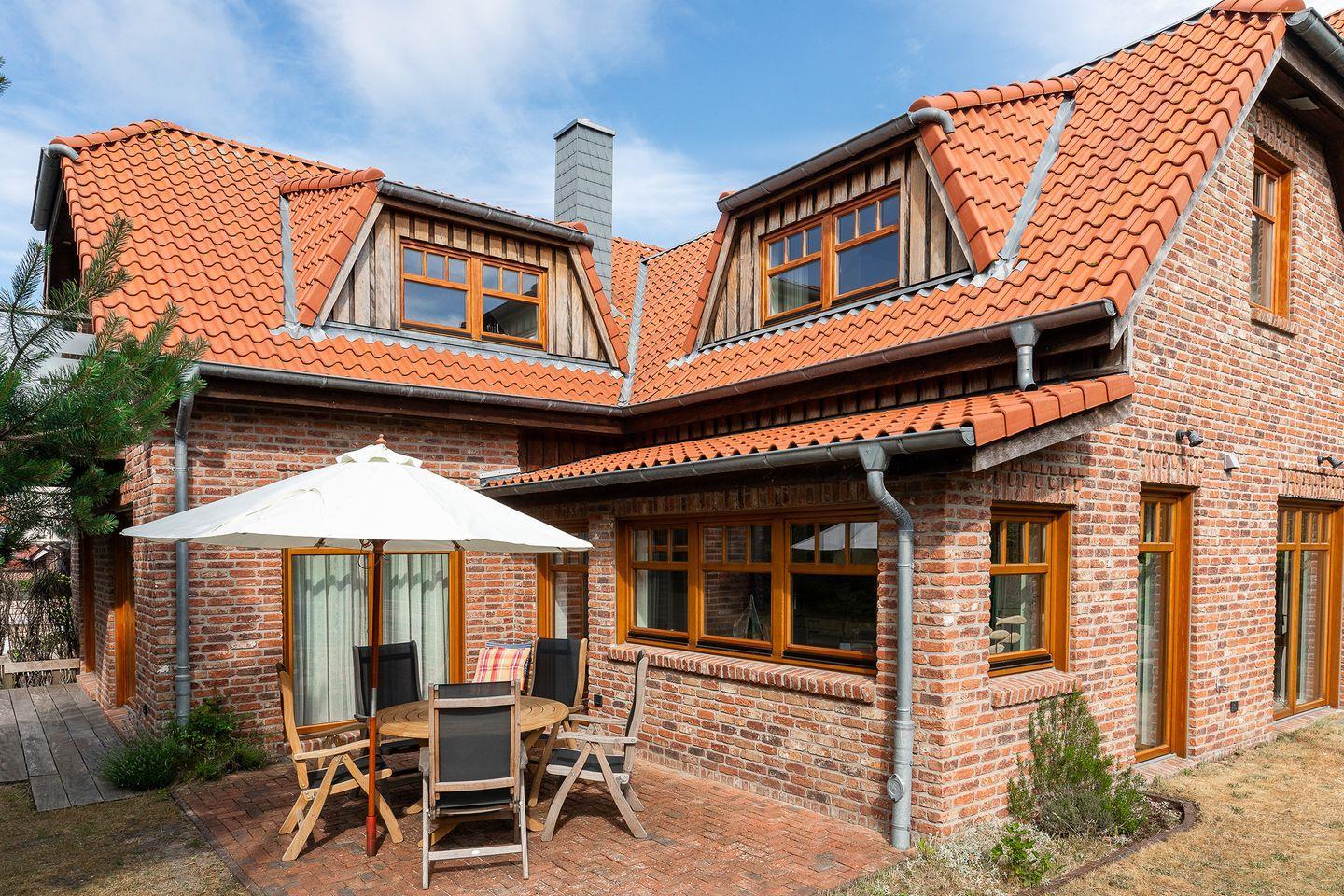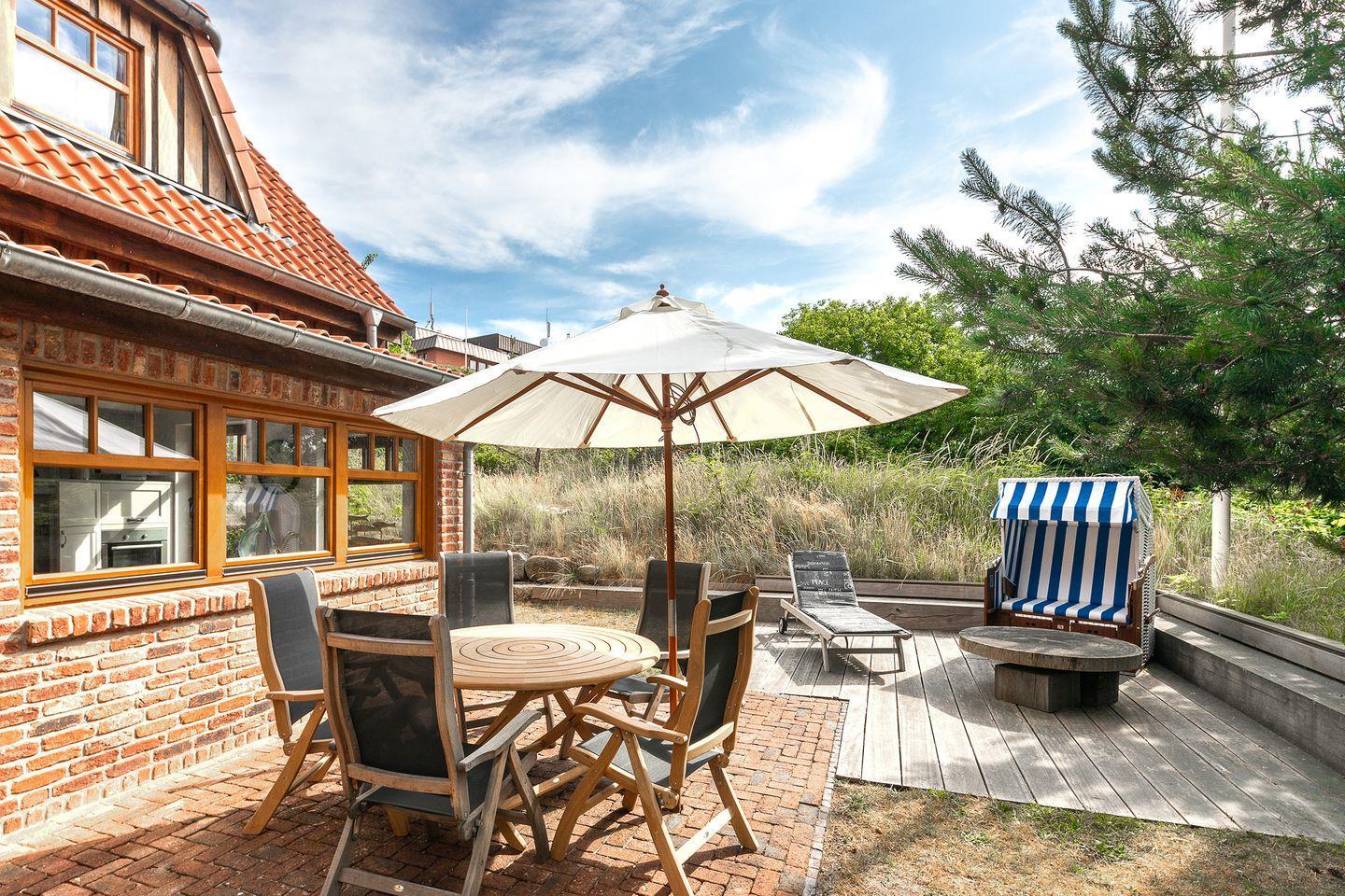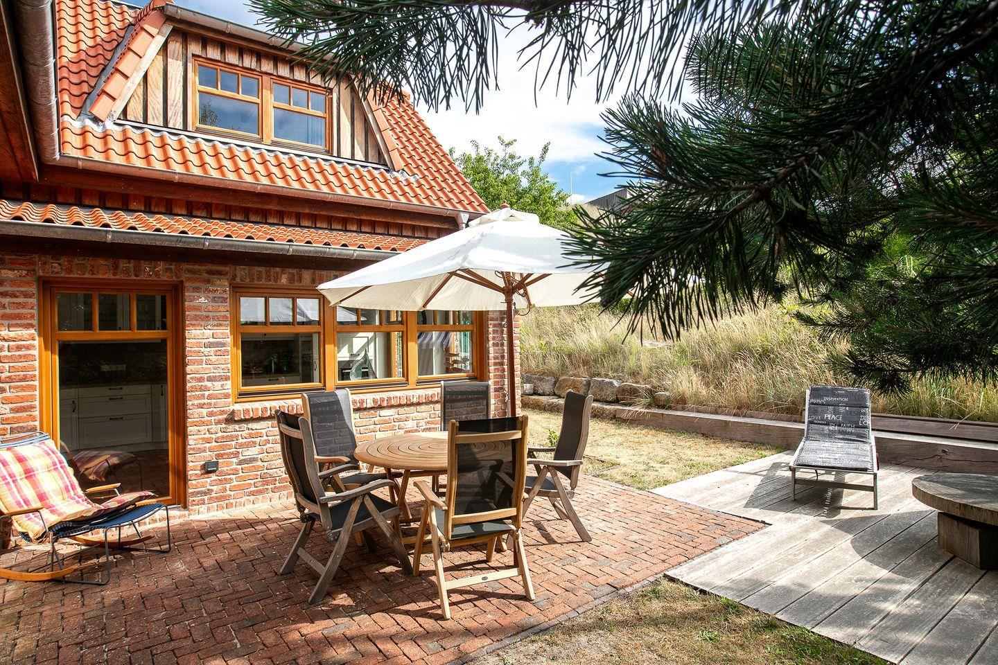 Die Terrasse zur Südseite mit einer Fläche von etwa 20m² ist umgeben von einem Garten und liegt geschützt in der Düne.