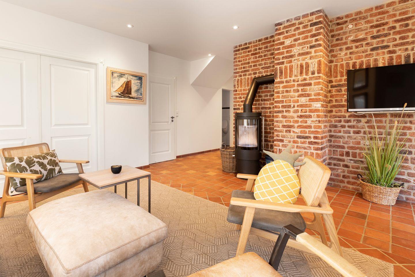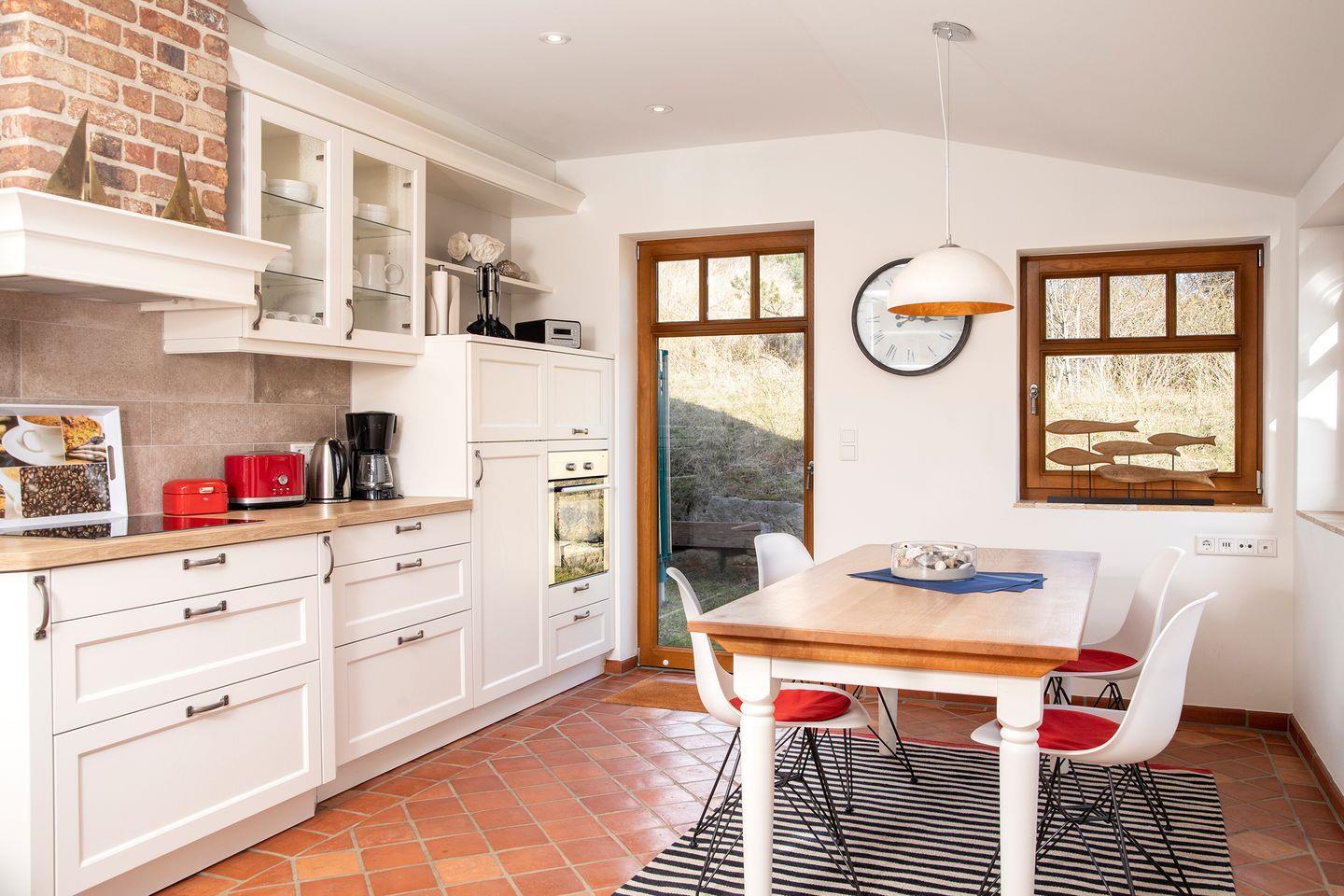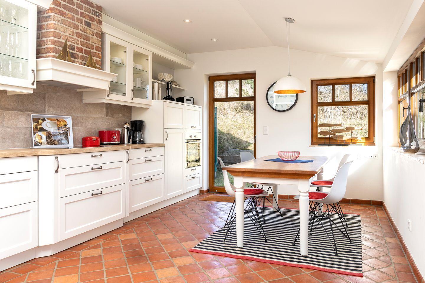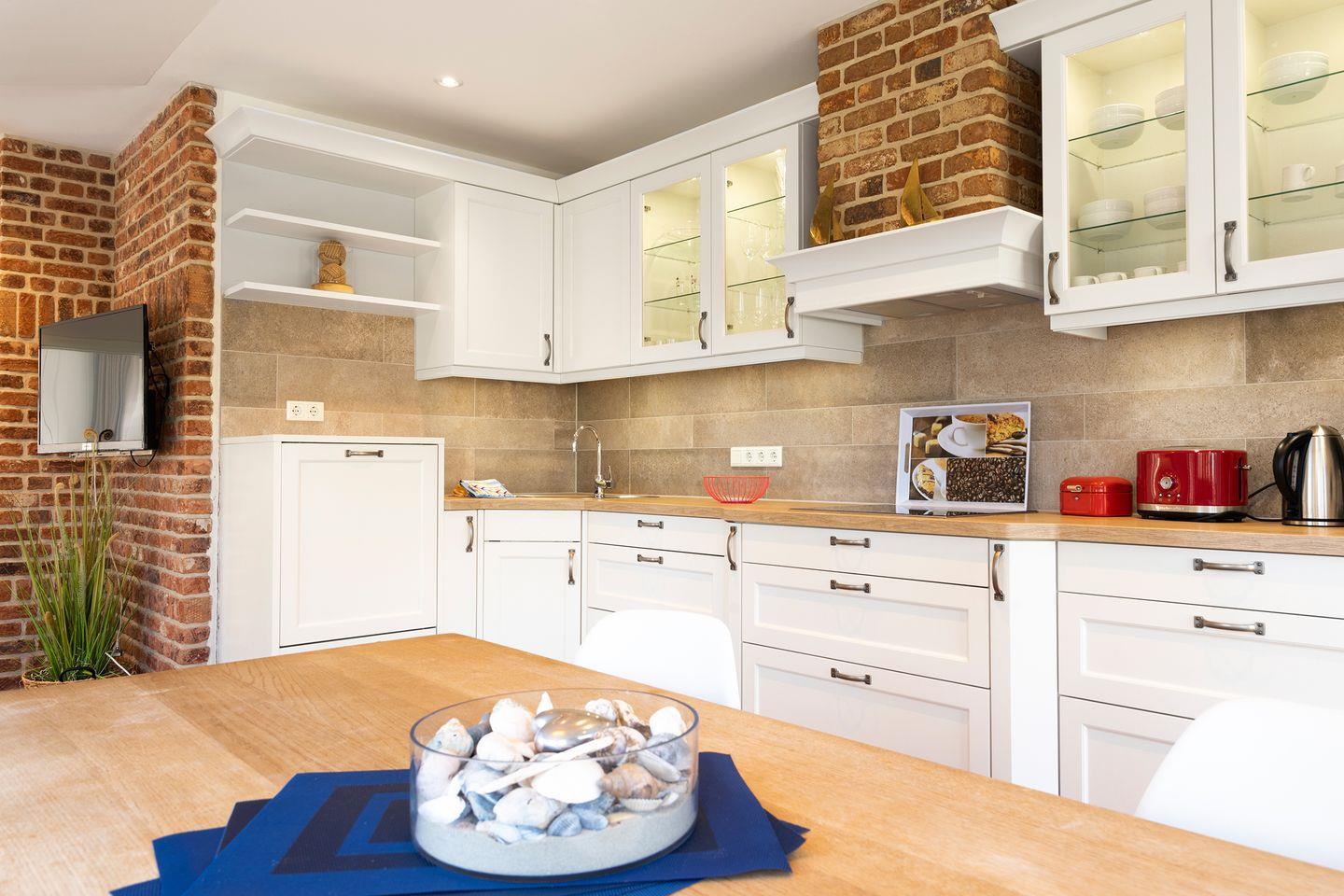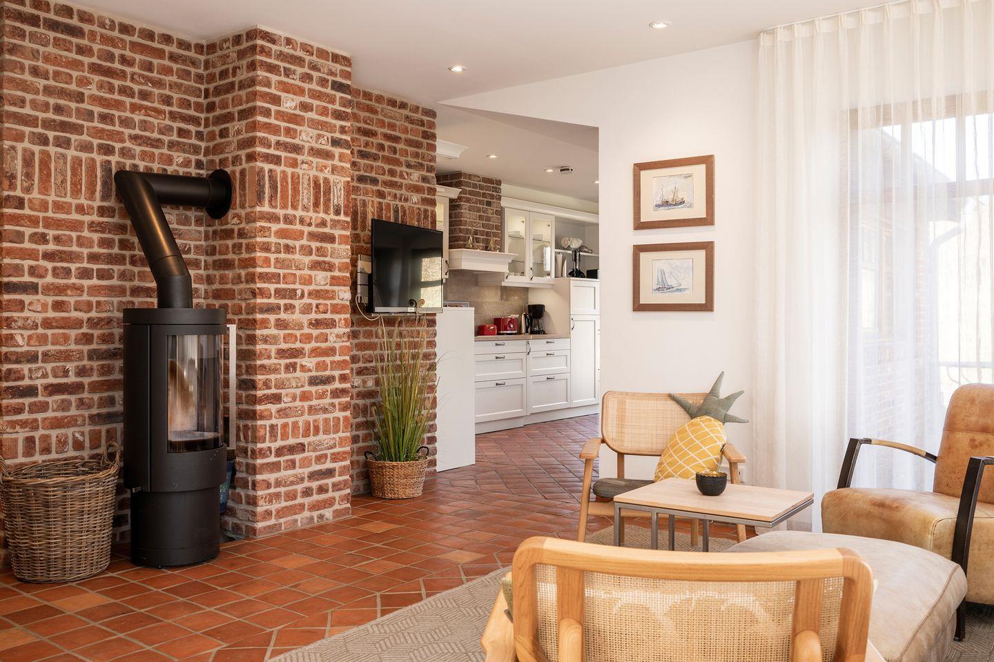 Der Wohnraum mit Kamin grenzt an die offene Wohnküche. Diese ist mit einem 4-Felder Ceranherd und Backofen, Kühlschrank mit TK-Fach, Geschirrspüler, Wasserkocher, Toaster, Filterkaffeemaschine und Küchentüchern ausgestattet.