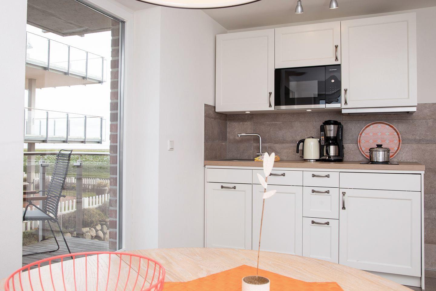 Das Einraum-Appartement kombiniert Wohn-, Ess- und Schlafbereich mit einer angrenzenden Küchenzeile. Diese umfasst einen Herd mit 2 Ceranfeldern, Mikrowelle, Kühlschrank mit TK-Fach, Geschirrspüler, Wasserkocher, Toaster, Filterkaffeemaschine und Küchentüchern.
