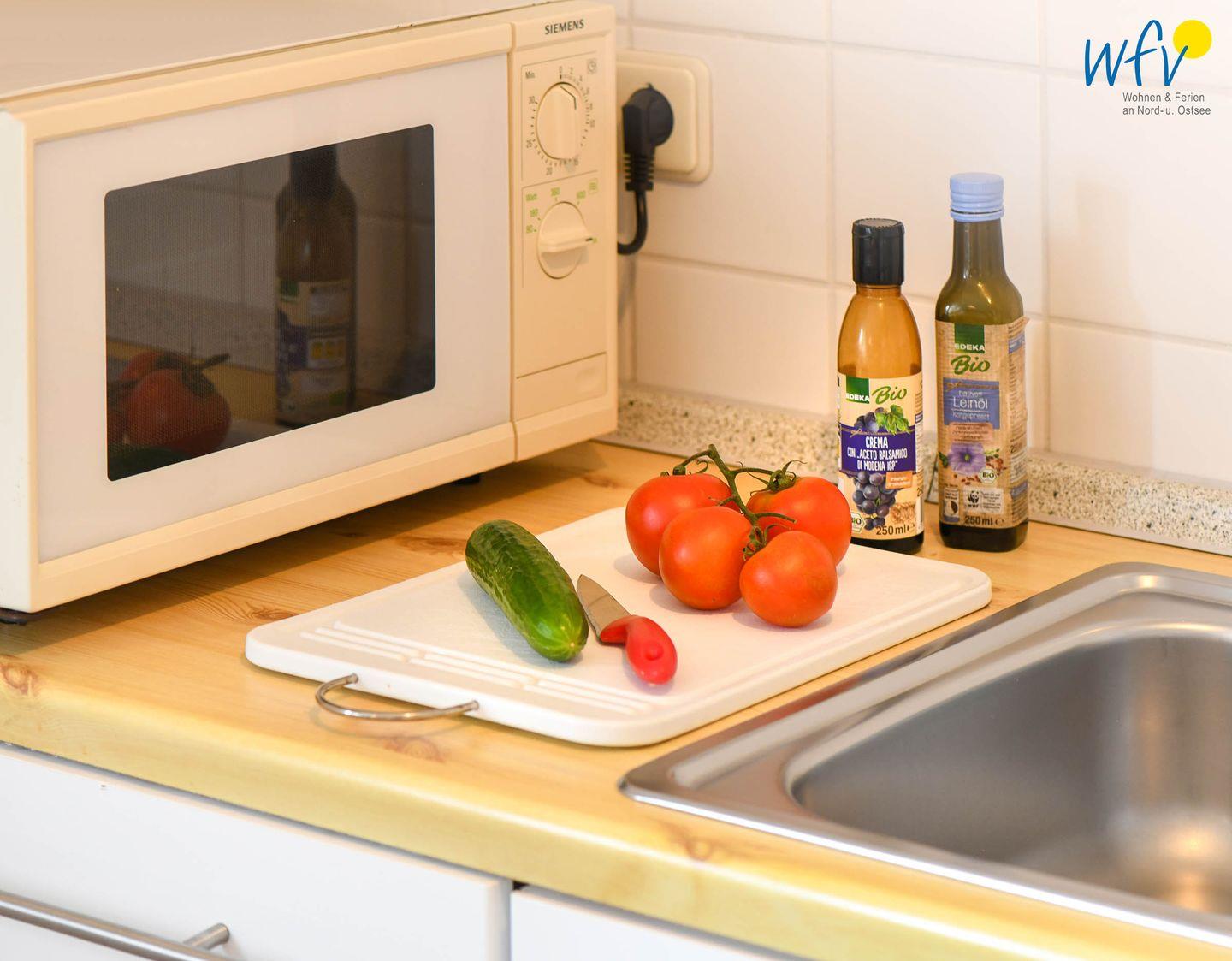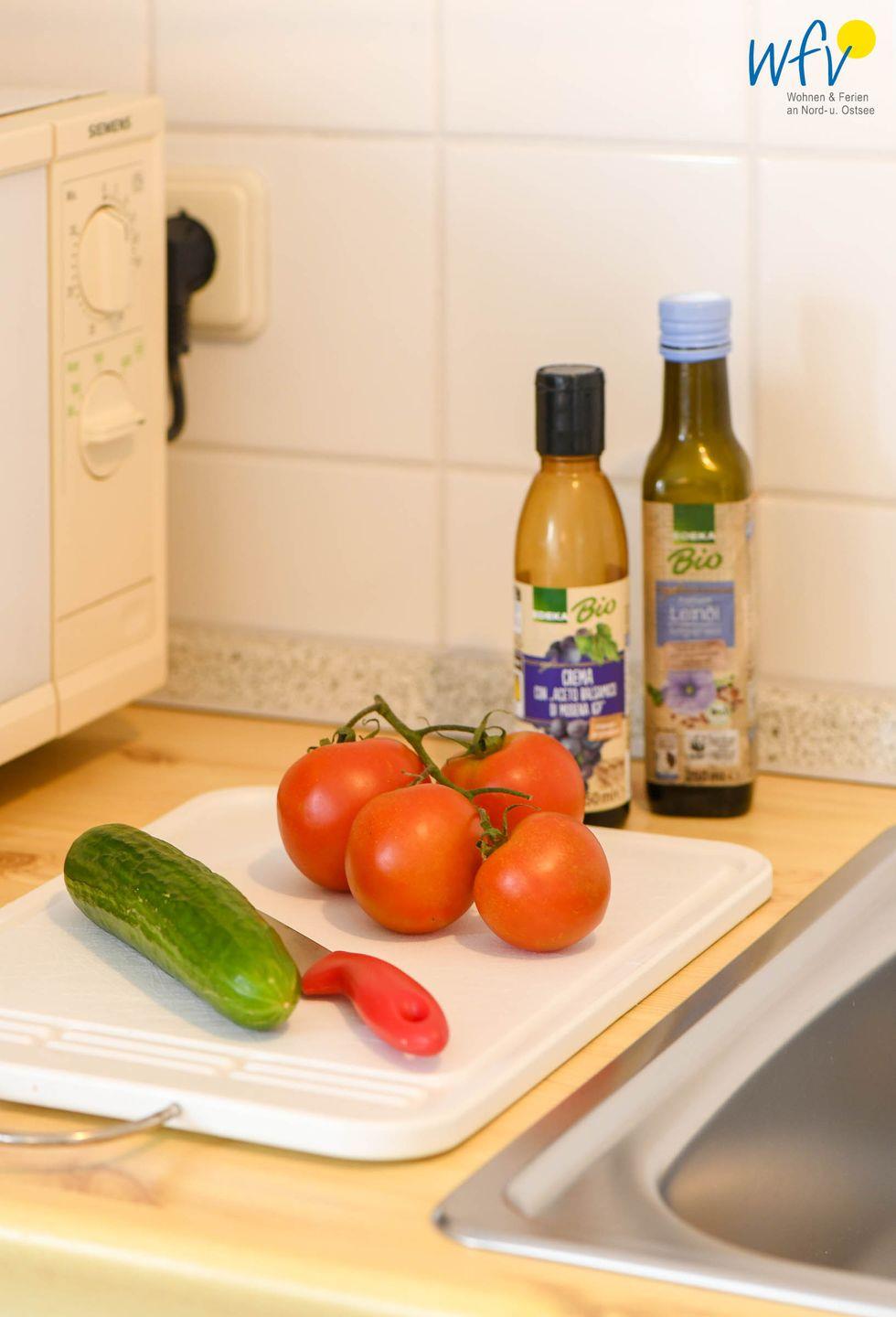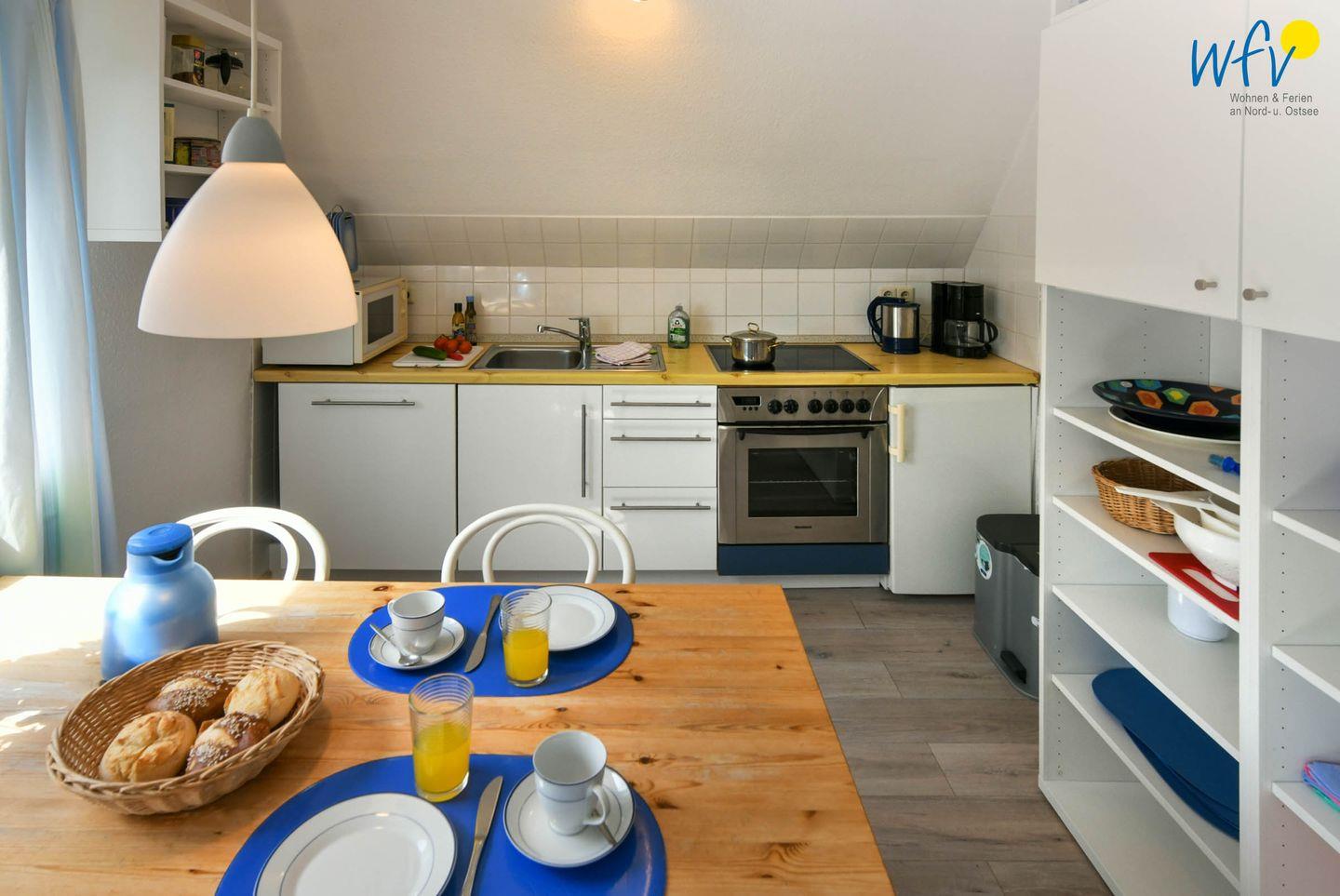 In der offenen Küchenzeile lassen sich schnell und einfach leckere Gerichte zubereiten. Sie ist u.a. mit einem Herd, einem Backofen und einer Spülmaschine ausgestattet. Für gemeinsame Mahlzeiten befindet sich hier ein Esstisch mit Blick nach draußen.