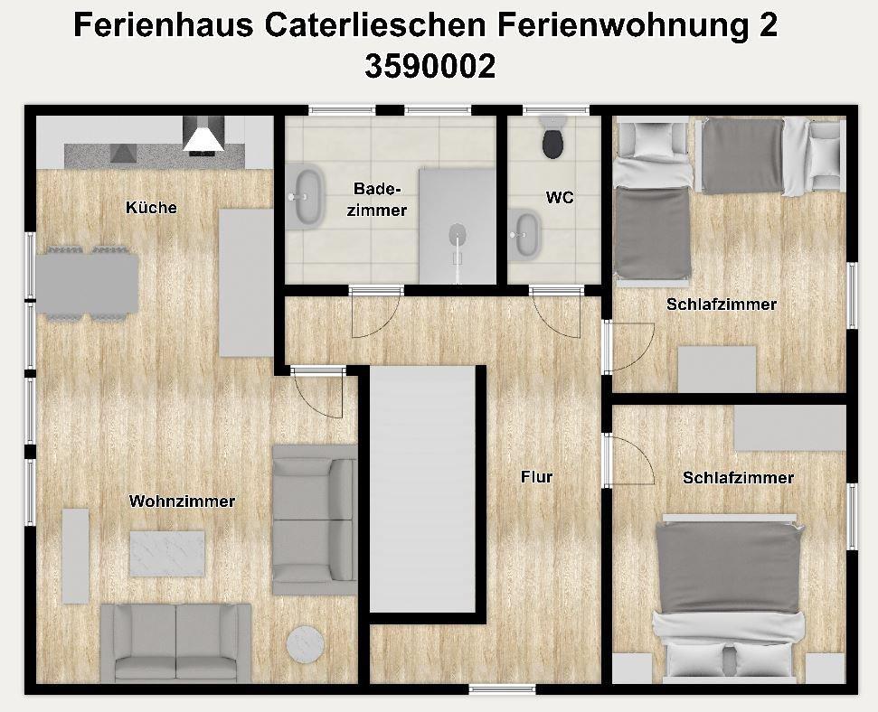 Herzlich willkommen in unserer gemütlichen Ferienwohnung im "Ferienhaus Caterlieschen"! Auf einer Wohnfläche von 75 m² erwartet Sie eine optimale Raumaufteilung – mit einem großen Wohnraum, einer integrierten Küchenzeile, zwei separaten Schlafzimmern und einem Duschbad mit separatem WC.
