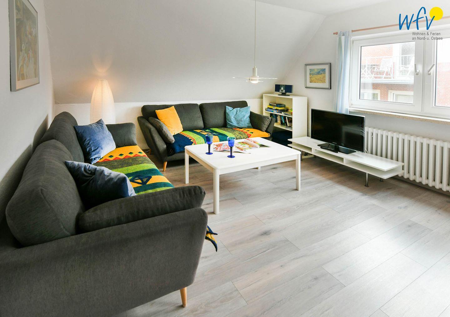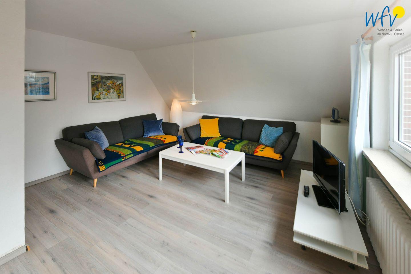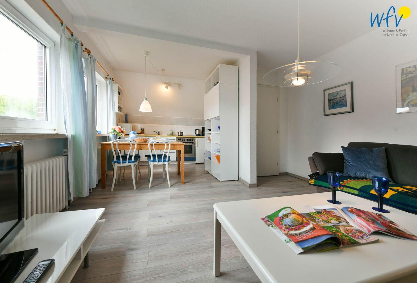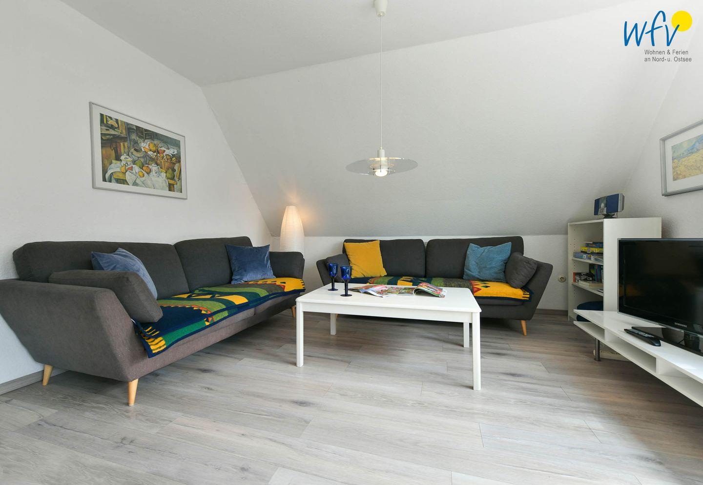Nach der Fahrradtour oder dem Strandtag lädt der gemütliche Wohnraum mit schöner Abendsonne zum Entspannen ein. Auf den zwei Sofas mit TV und Radio können Sie es sich bequem machen. Zum Surfen vom Smartphone aus empfangen Sie kostenlos freies WLAN.