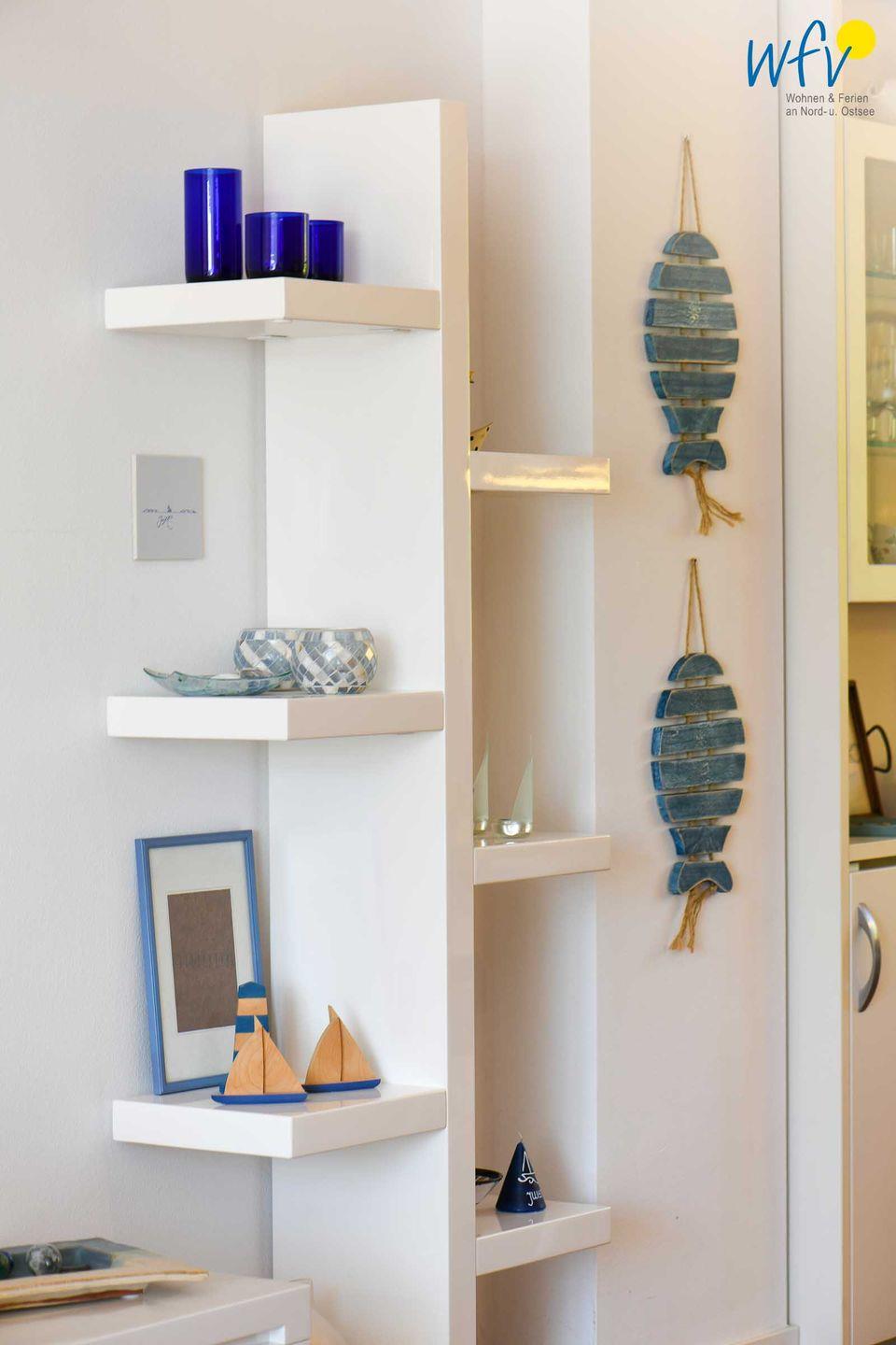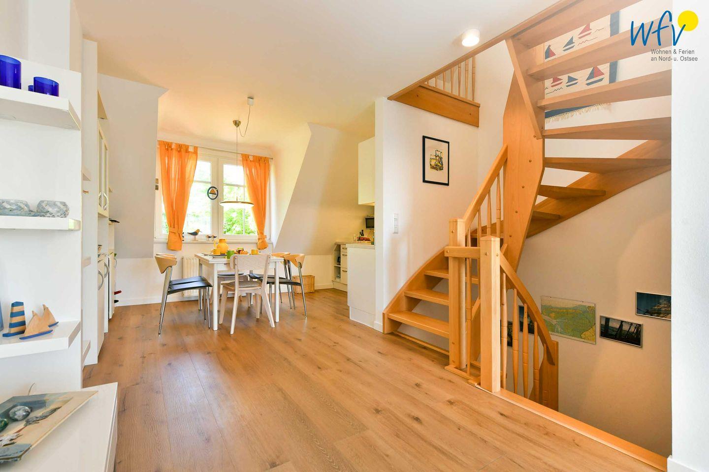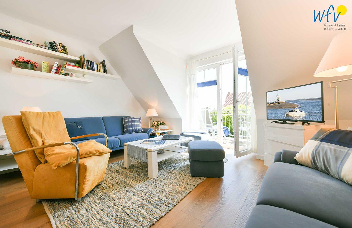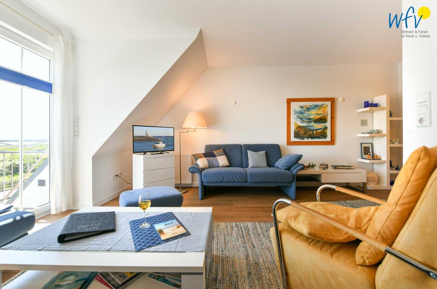 Im hellen Wohnraum (1.OG) empfängt Sie eine einladende Einrichtung in harmonischen Farben; maritime Accessoires sorgen für gemütliches Flair und das entsprechende Nordseegefühl. Von diesem Raum aus sehen Sie bereits sehr schön das Wattenmeer!
