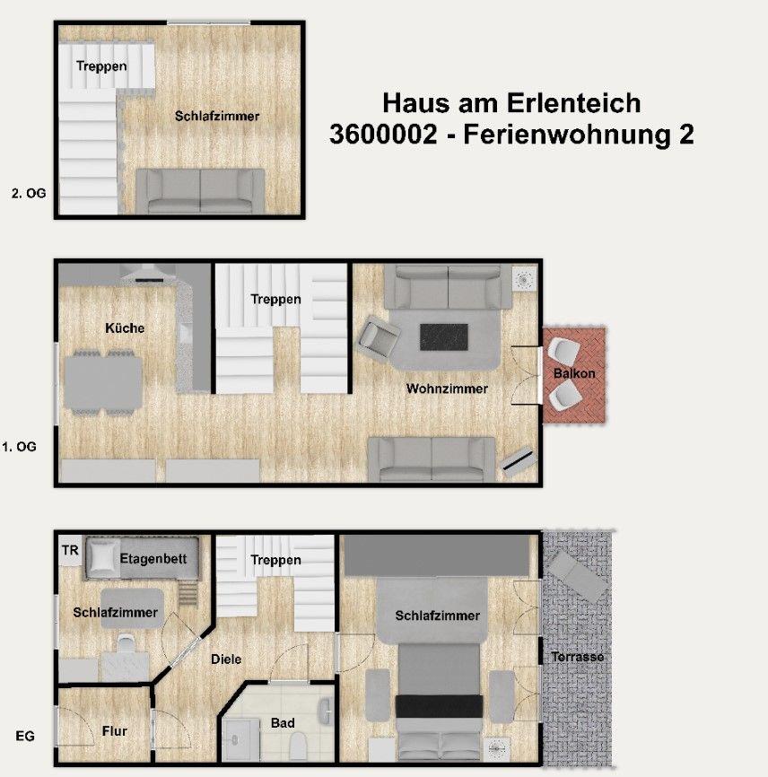 Durch die optimale Raumaufteilung über drei Etagen mit großem Wohnraum und drei separaten Schlafzimmern bietet Ihnen die Ferienwohnung Platz für einen Urlaub mit bis zu sechs Personen.