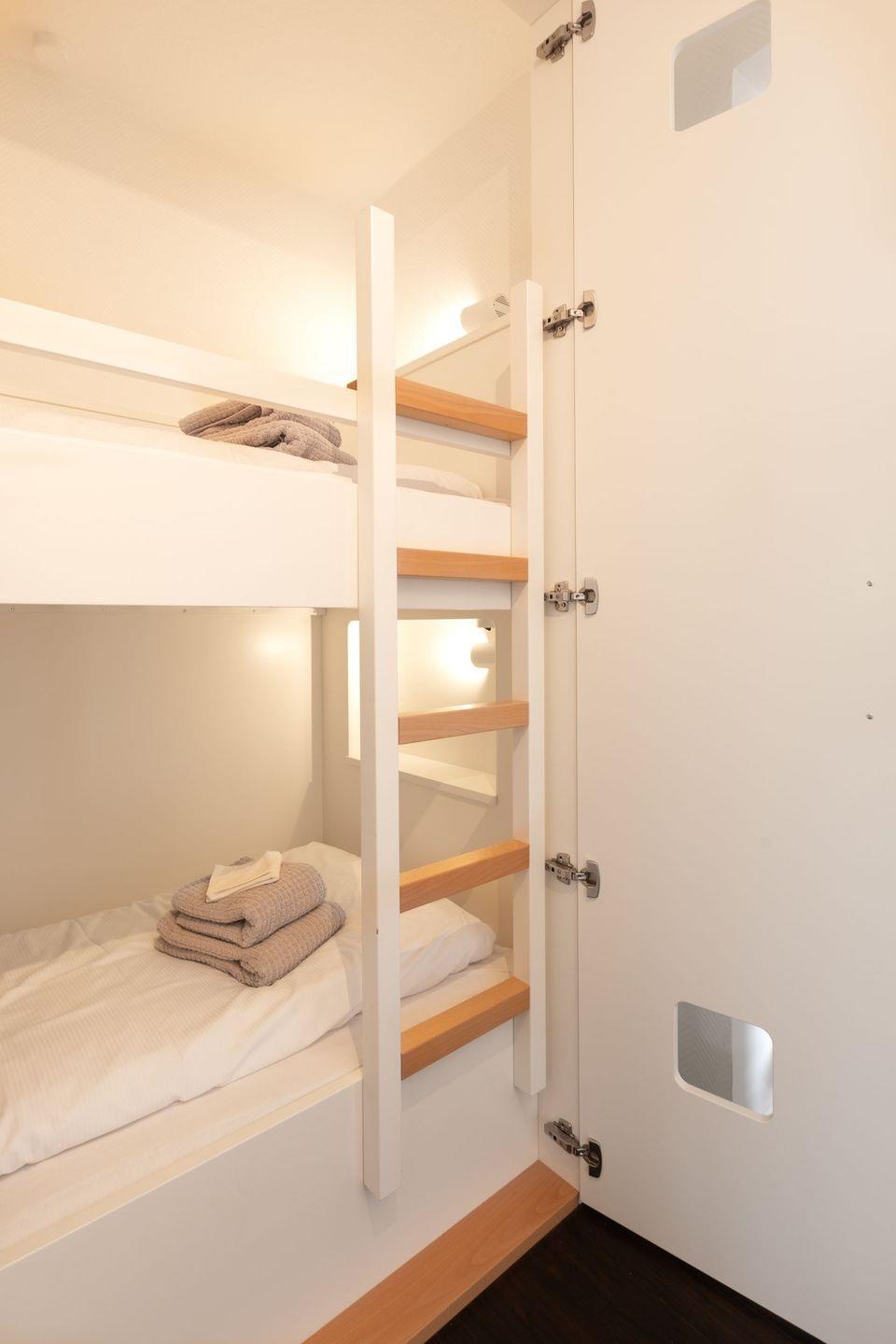 Das Badezimmer mit Fenster bietet eine große, ebenerdige Dusche sowie Waschbecken und WC. Seife, Duschgel und Shampoo stehen für Sie bereit. Zwei zusätzliche ostfriesische Schlafkojen in Form eines Etagenbettes befinden sich abseits vom Wohnraum.