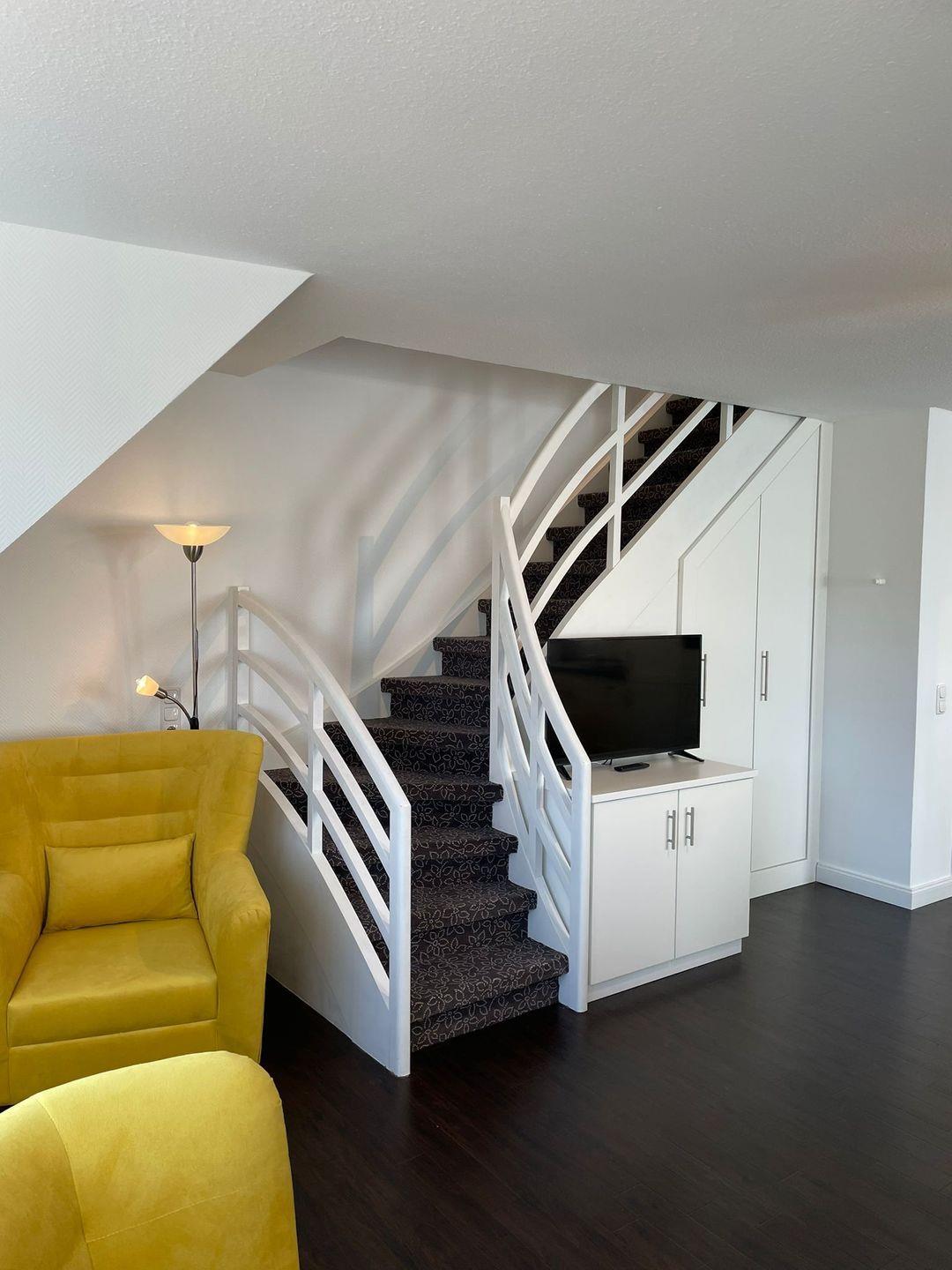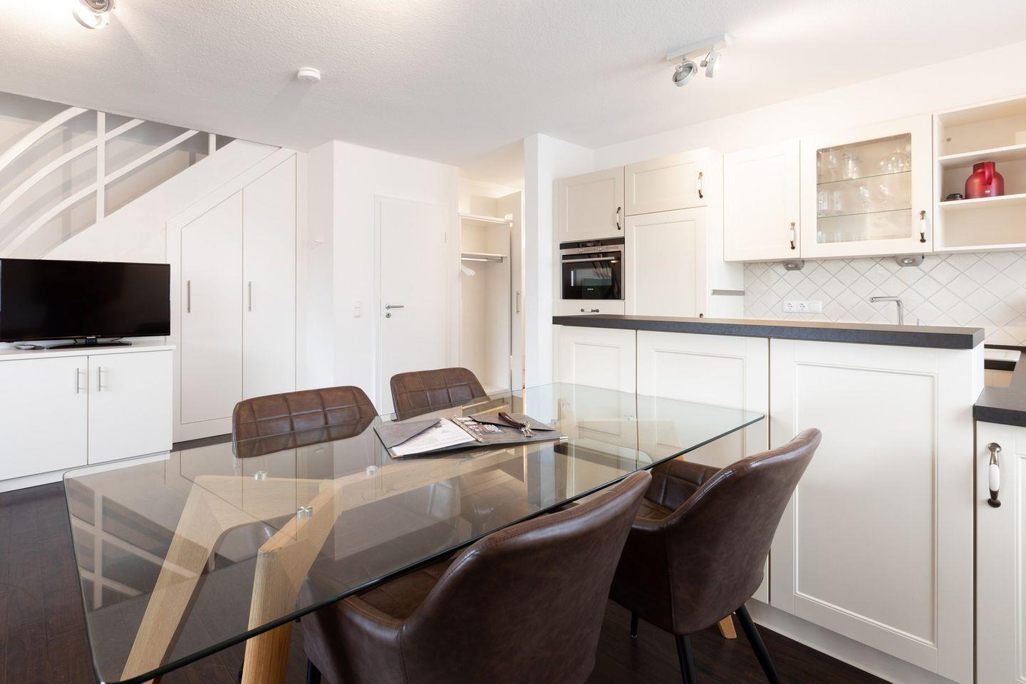 Genießen Sie den Komfort einer Westterrasse und eines Balkons zur Ostseite, die Ihnen sowohl Morgen- als auch Abendsonne bieten. Das Wohnzimmer im unteren Bereich verfügt über einen Flachbild-TV und lädt mit einem großen Esstisch, einem gemütlichen Sofa und zwei Lesesesseln zum Verweilen ein. Die Studioküche ist komplett ausgestattet mit Mikrowelle, Wasserkocher, Kaffeemaschine, Toaster und Spülmaschine.