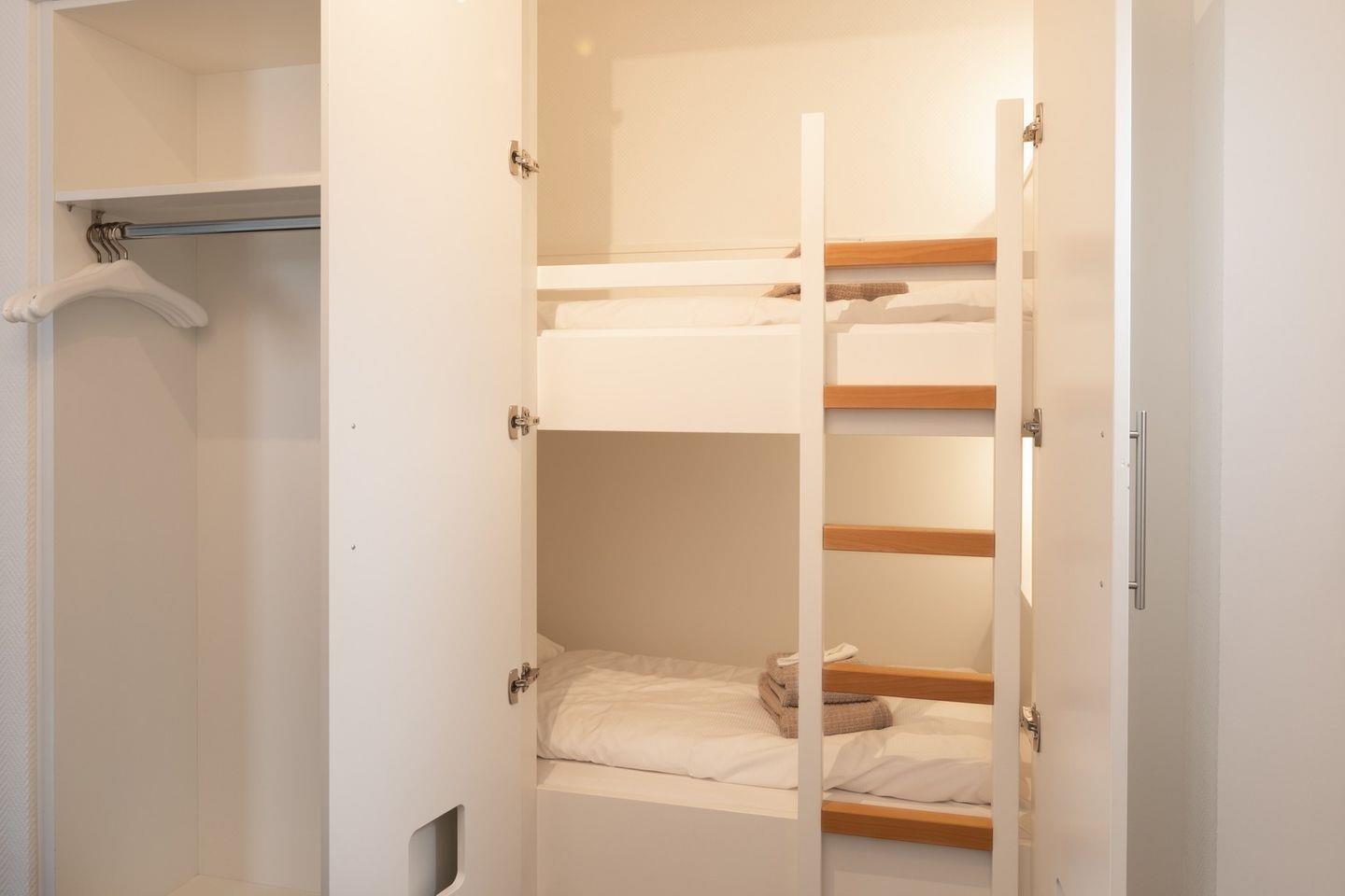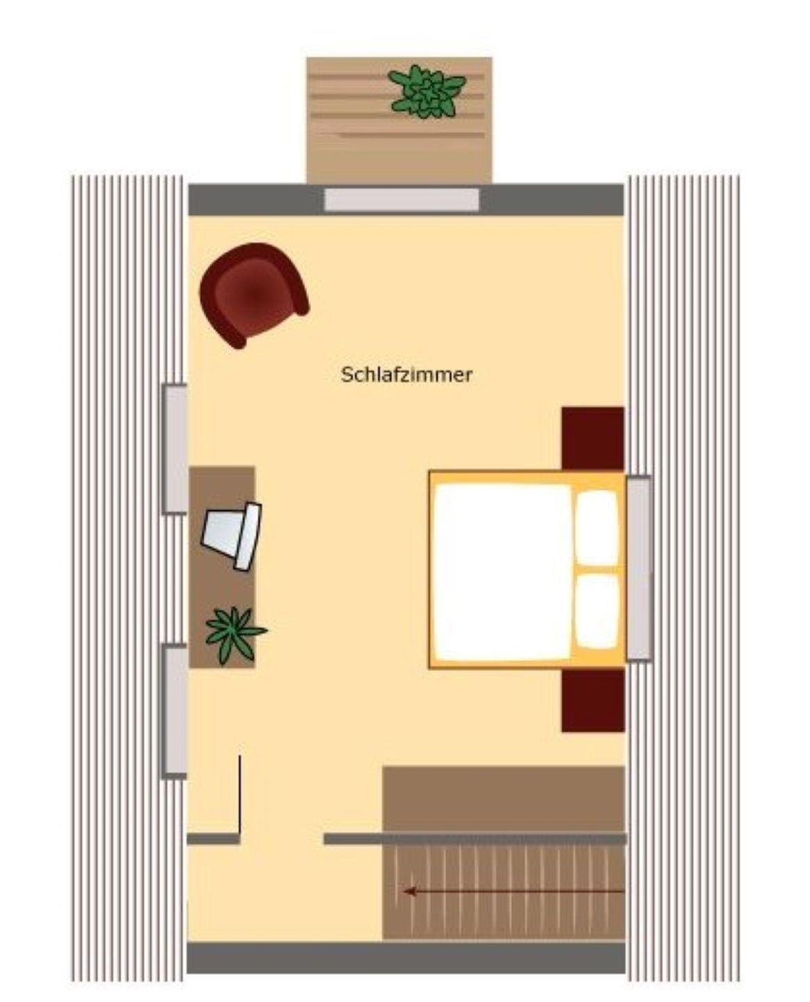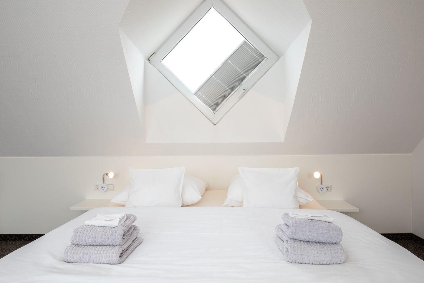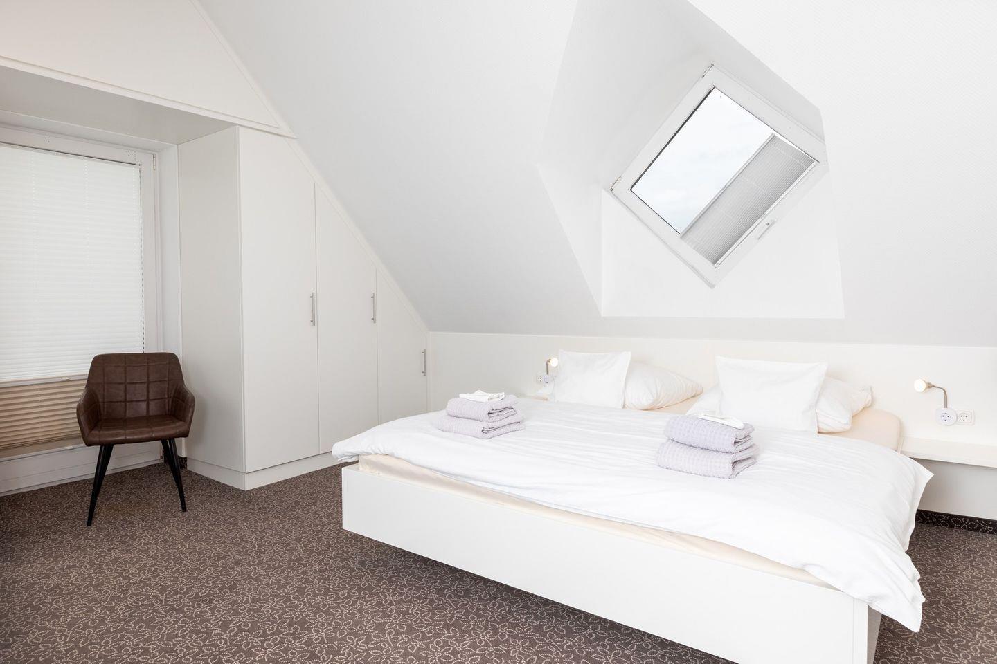 Im Schlafzimmer unter dem Spitzdach finden Sie ein komfortables Doppelbett (180 x 200 cm), einen Schreibtisch, großzügige Schränke, einen Safe und ebenfalls einen Flachbild-TV. Es gibt zusätzlich einen kleinen Balkon mit Nordseeblick.