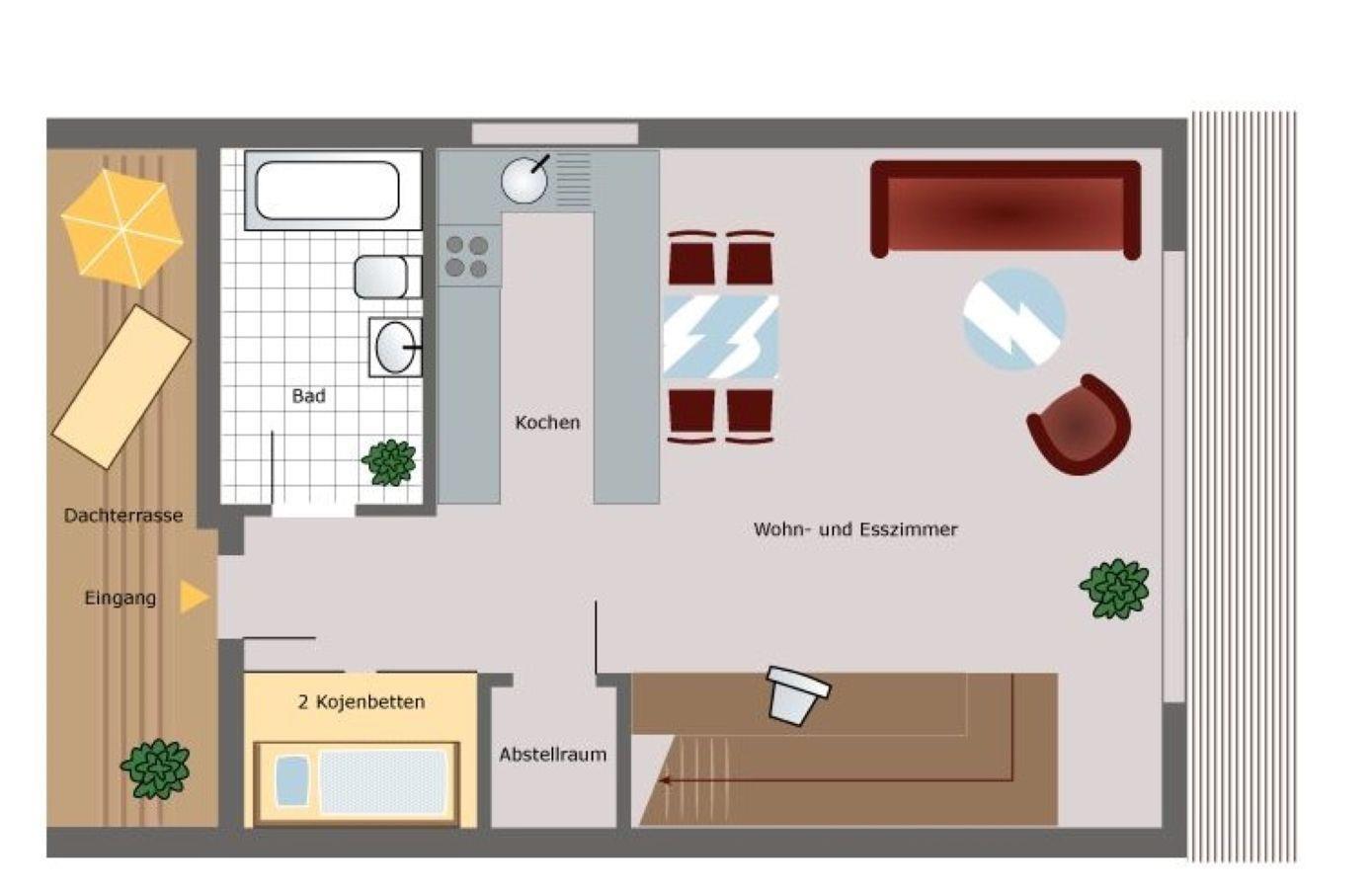 Unser rauchfreies Maisonette-Appartement in der Strandstraße bietet vollen Komfort. Das Wohn- und Schlafzimmer ist mit einem Smart-TV ausgestattet. Ost- und Westfenster sorgen für Morgen- und Abendsonne. Die Studioküche verfügt über einen Backofen, Wasserkocher, Kaffeemaschine, Toaster und Spülmaschine. Bad mit Dusche/WC. Zwei ostfriesische Schlafkojen (Etagenbett). Waschmaschine, Trockner im Gemeinschaftswaschraum. Bettwäsche/Handtücher inklusive. Babybett kostenlos.