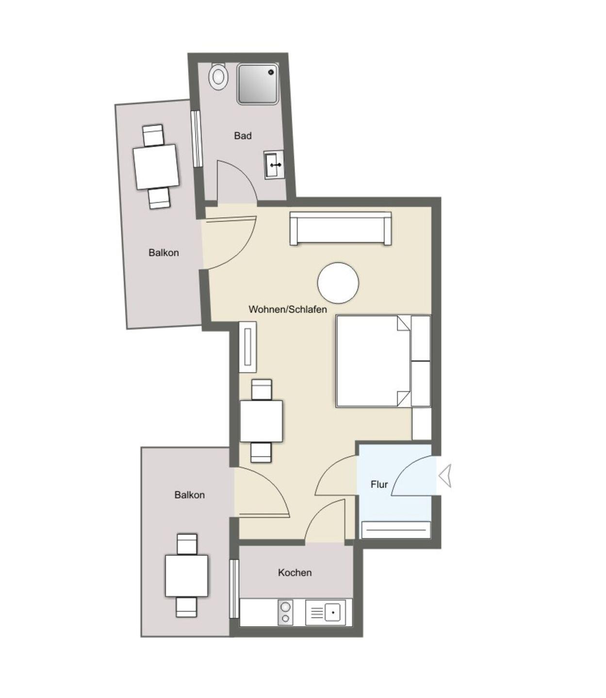 1 Zimmer Appartement mit 2 Balkonen zum Kurplatz im Zentrum der Insel Juist