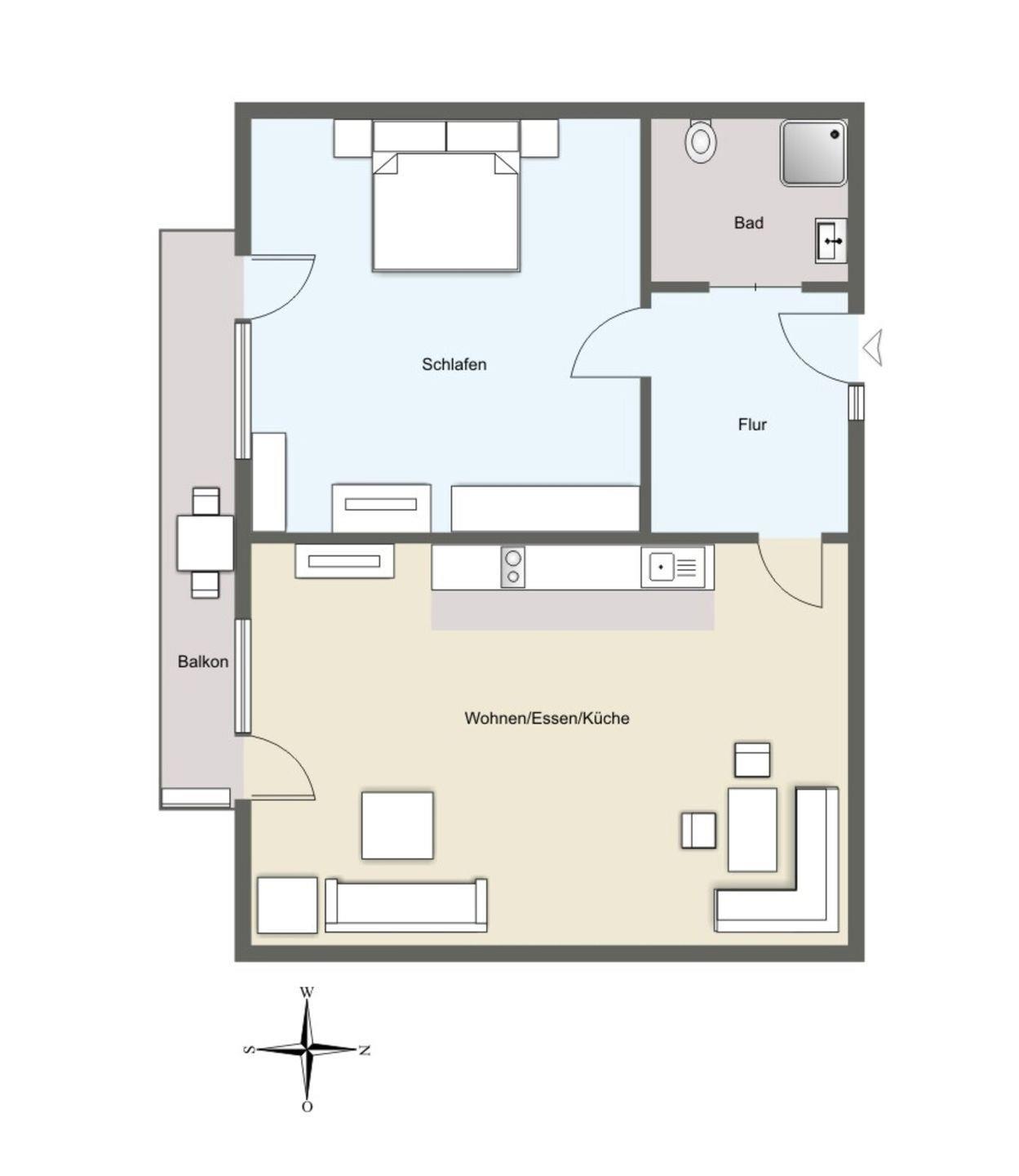 Komfortables 2- Zimmer- Appartement mit einem separaten Schlafzimmer mit Boxspringbett, TV- Gerät und Zugang zum Südbalkon mit Blick zum Watt und Hafen, einem Wohnzimmer mit einer Küchenzeile mit Geschirrspüler, Mikrowelle (Kombigerät), einem Schlafsofa mit integrierter Matratze, TV- Gerät und mit Zugang zum Südbalkon mit Blick Richtung Hafen und Watt, Flur, Bad mit einem Duschradio