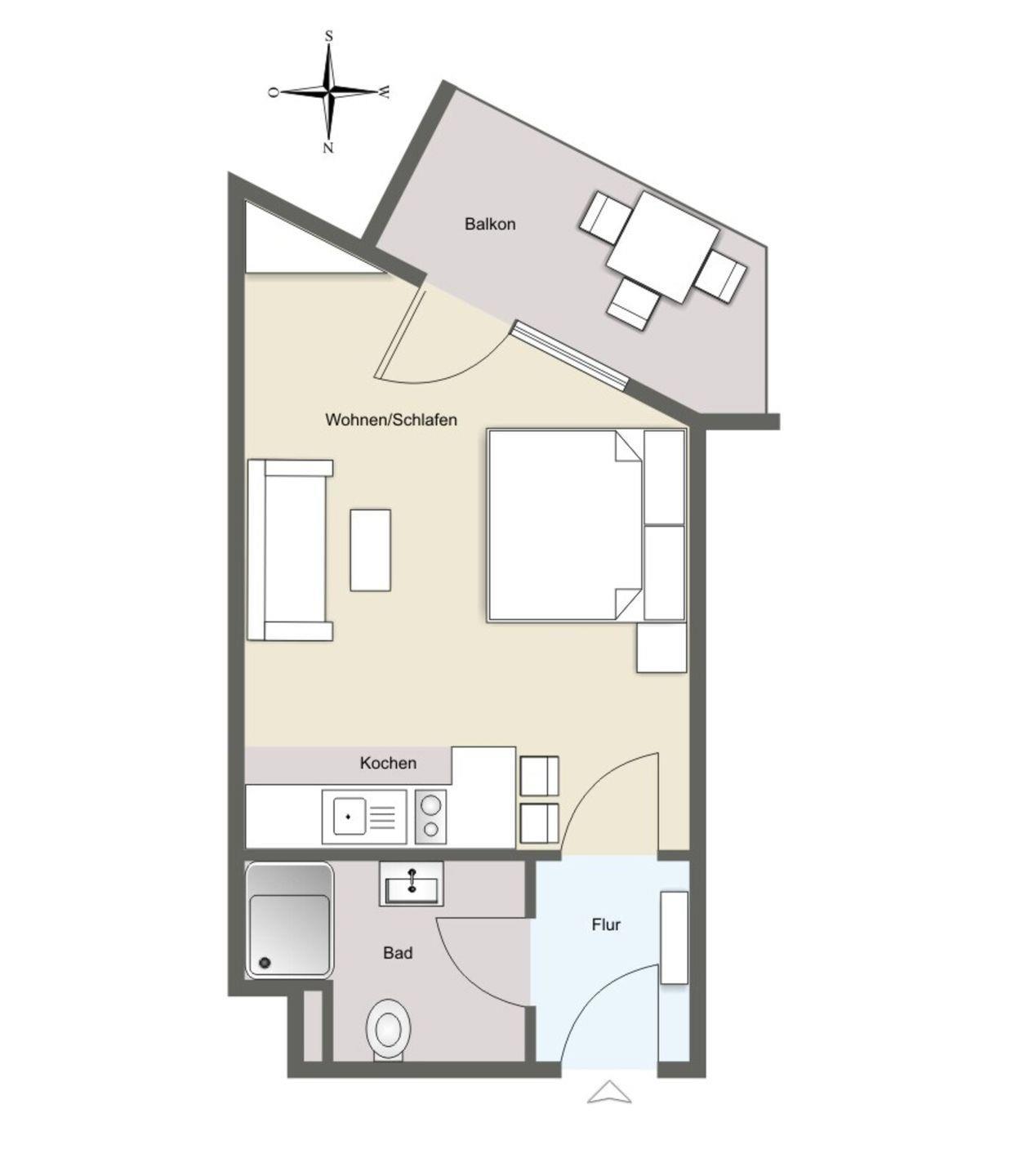 Mit einer Größe von 26 m² bietet die Kleine Wolke Platz für bis zu zwei Personen. Die Wohnung befindet sich im 3. Stock und ist bequem mit dem Aufzug erreichbar. Es erwartet Sie eine offene Küche, die mit allem ausgestattet ist, was Sie für Ihren Aufenthalt benötigen. Vom Kühlschrank über einen 2-Platten-Herd bis hin zur Kaffeemaschine und Küchenutensilien – hier bleiben keine Wünsche offen. Der Essbereich und die Sofaecke laden dazu ein, gemütliche Stunden gemeinsam zu verbringen.