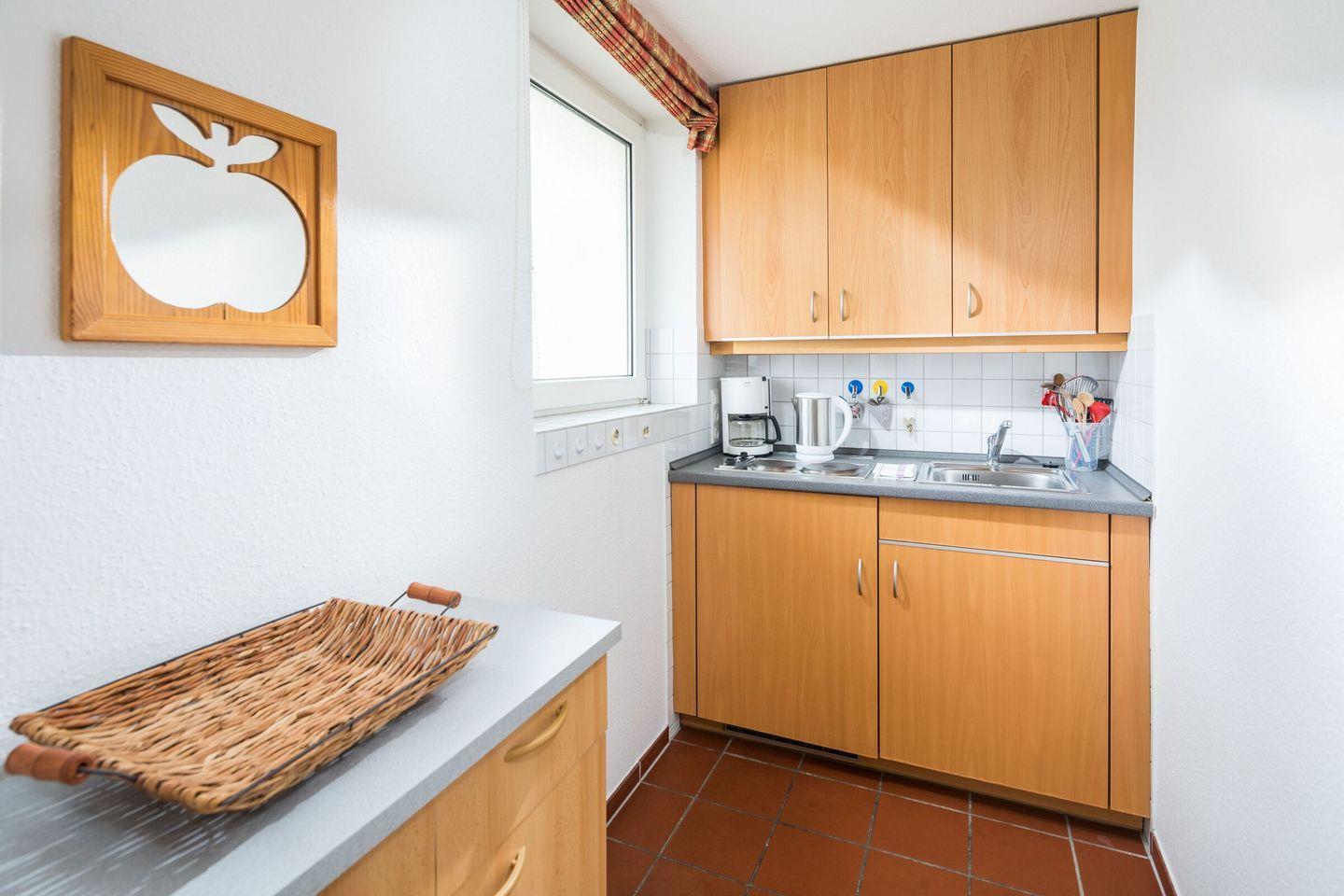 Die Küchenausstattung umfasst einen Kühlschrank mit Gefrierfach, ein 2-Platten Kochfeld, ein Wasserkocher und Toaster bis hin zu Küchenutensilien und sogar einer Kaffeemaschine für den perfekten Kaffeegenuss am Morgen.