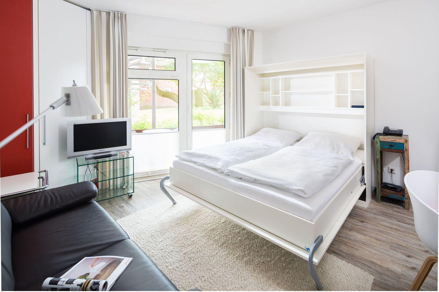 Die Wohnung verfügt über einen Wohn- und Schlafbereich mit einem ausklappbaren Schrankbett. Hier kann tagsüber das Bett hochgeklappt werden, so dass man genug Platz zum verweilen hat. Die Küche ist ausgestattet mit einem 2-Platten-Herd, Kühlschrank, Toaster, Wasserkocher und einer Filterkaffeemaschine.