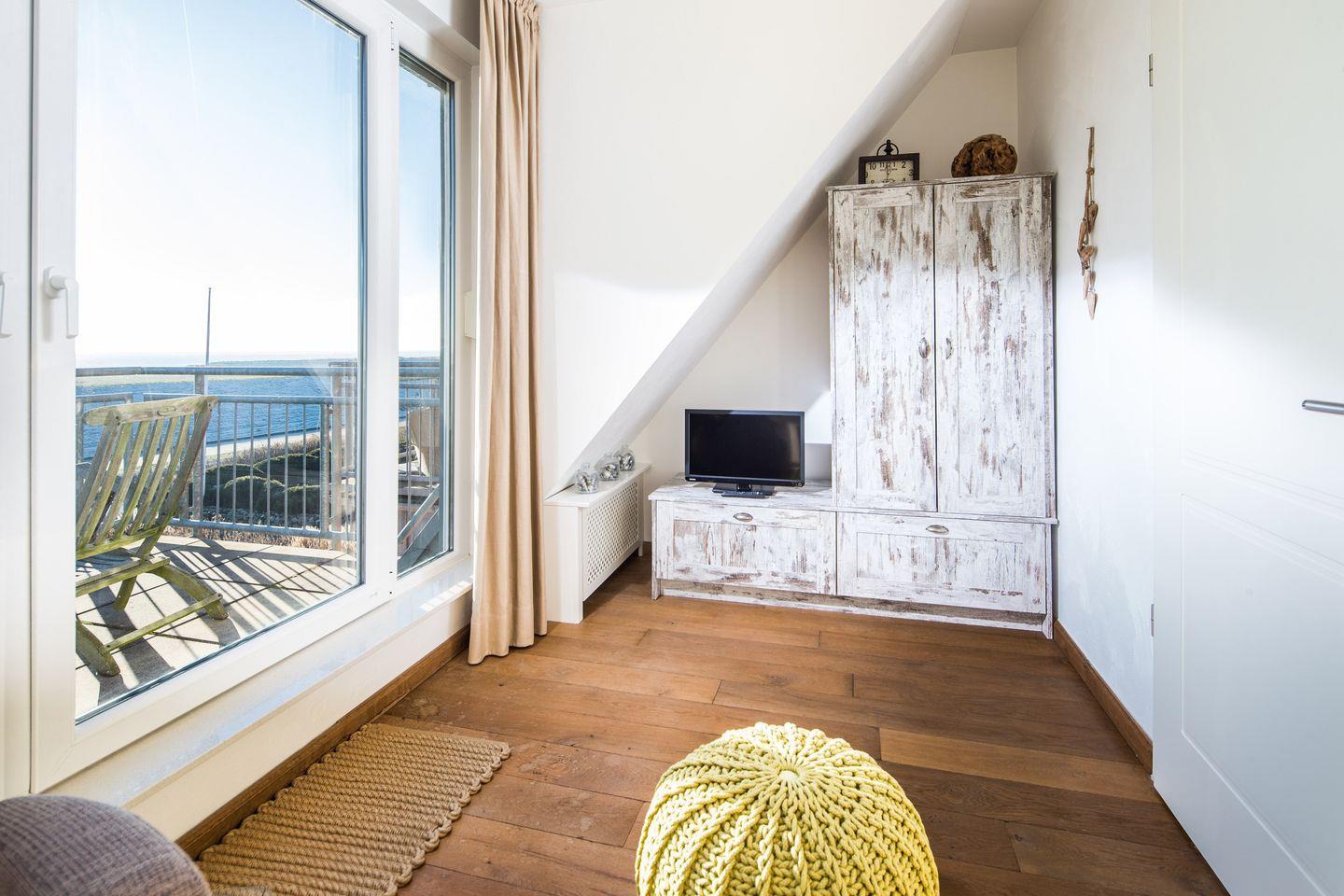 … von den zwei Südbalkonen mit herrlichem, uneingeschränkten Blick über das Wattenmeer bis aufs Festland! Luxusambiente in Spitzenlage (ruhig gelegen und doch nur wenige Schritte in den Ortskern oder zum Strand) erwarten Sie in dem knapp 80qm großen, hochwertig und geschmackvoll eingerichteten Feriendomizil. Im ersten Stock befindet sich das komfortable, sonnendurchflutete Wohn-Esszimmer mit Flat-Kabel-TV, CD/Radio/DVD-Anlage, W-LAN und großer DVD- und Spielesammlung, sowie eine separate, moderne Markenküche (Mikrowelle, Ceranfeld, Spülmaschine, Jura-Kaffee-Vollautomat, Nespresso Kaffeemaschine, klassische Filterkaffemaschine, Waffeleisen, Heißluftfriteuse) und das Bad mit ebenerdiger Dusche, Waschmaschine und Trockner.