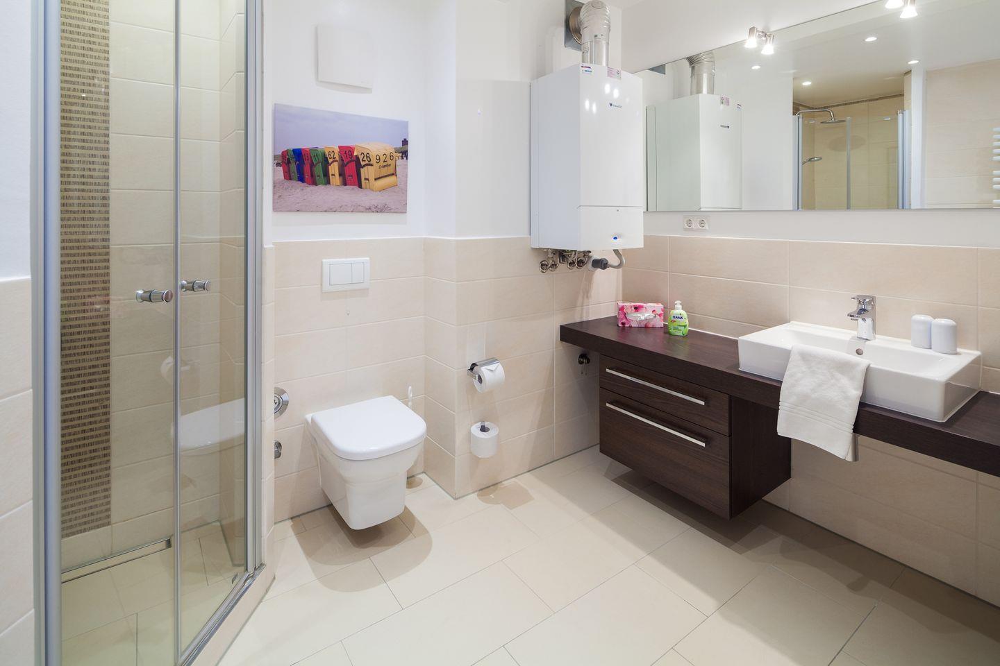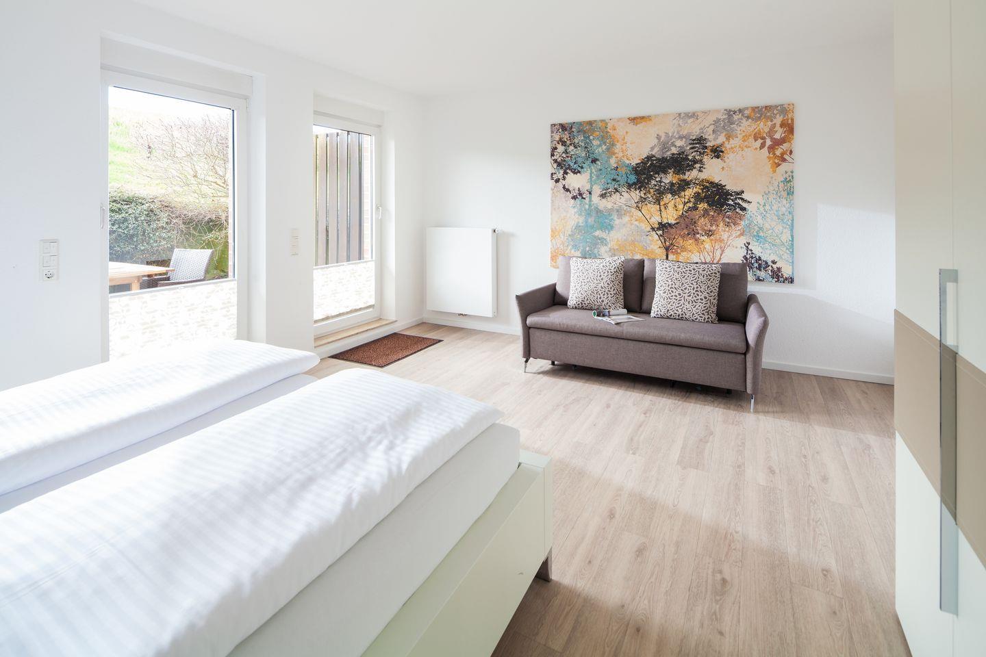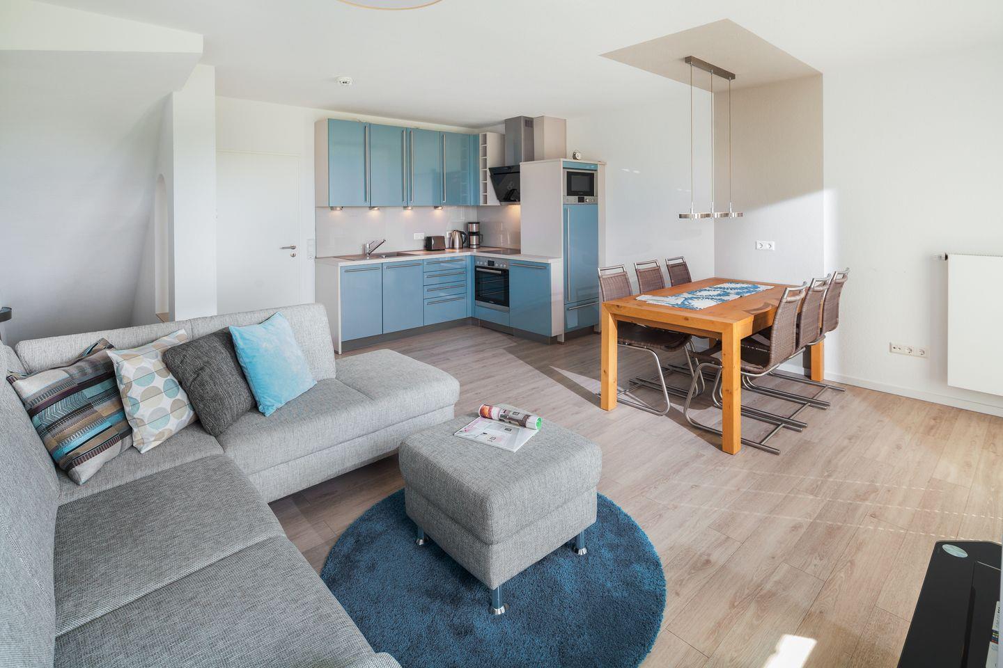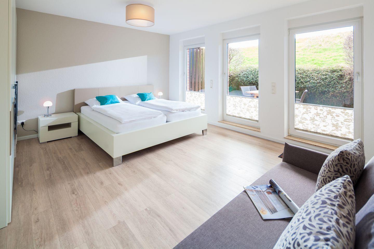 Das Appartement besticht durch das helle Wohnzimmer, das über einen gemütlichen Essbereich mit moderner Einbauküche und Blick Richtung Leuchtturm verfügt. Der zum Süden ausgerichtete Balkon lädt zum Sonnenbaden ein. Das angrenzende Gästezimmer zeigt nach Norden. Über eine Treppe gelangen Sie in den Souterrainbereich, mit einem Badezimmer und einem Schlafzimmer. Eine Flügeltür führt unmittelbar auf die geschützte Südterrasse, die von einem Friesenwall umgeben ist.