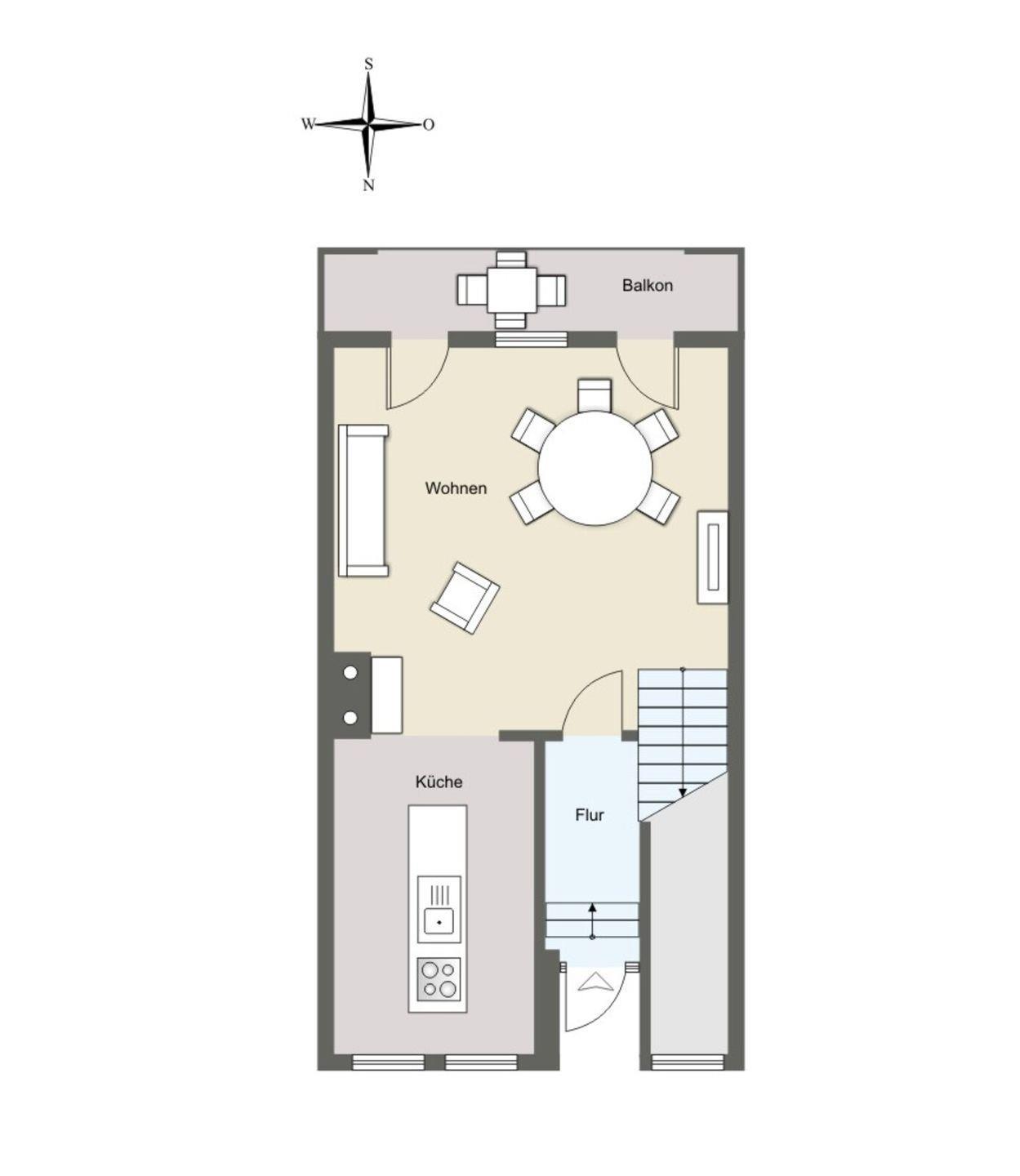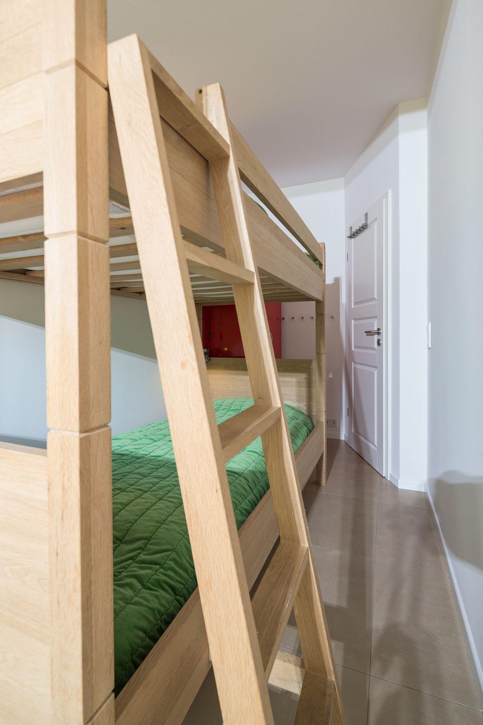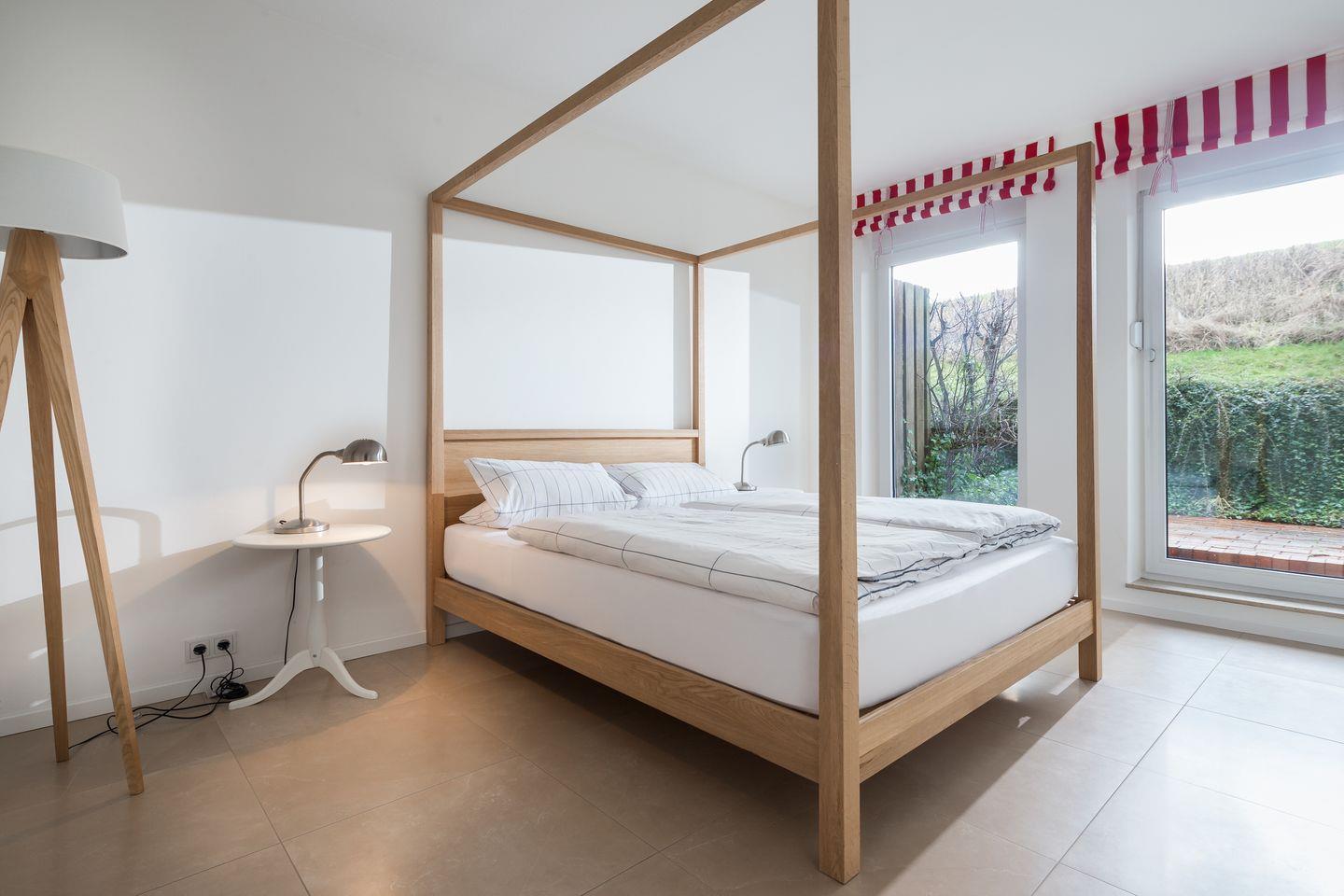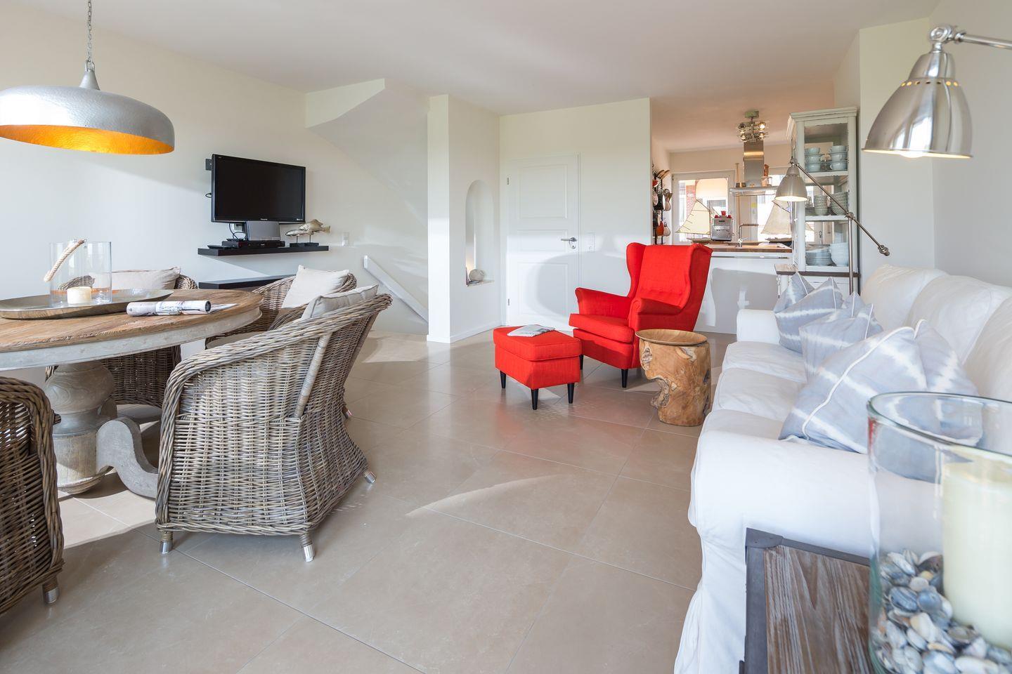 Über einen kleinen Flur gelangt man in das helle und sonnige Wohnzimmer, das über einen Essbereich mit moderner Kochinsel und Blick Richtung Leuchturm verfügt. Der nach Süden ausgerichtete Balkon lädt zum Sonnenbaden und Verweilen ein. Im Souterrainbereich befinden sich ein Schlafzimmer mit Doppelbett und ein Schlafzimmer mit Etagenbett. Über beide Räume gelangen Sie über eine Flügeltür auf die südlich ausgerichtete Terrasse. Sie wird von einem inseltypischen Friesenwall vor dem Wind geschützt.