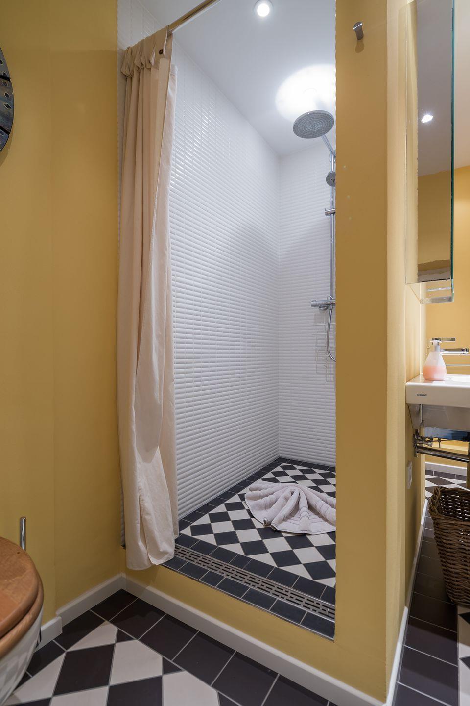 Eine Waschmaschine und ein Trockner befinden sich im Badezimmer.