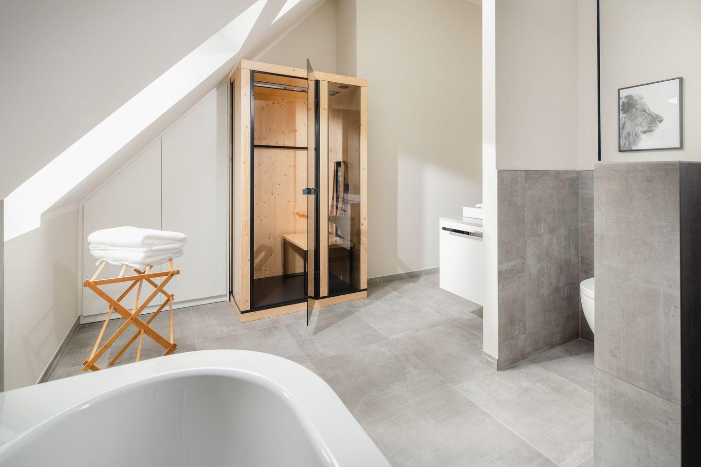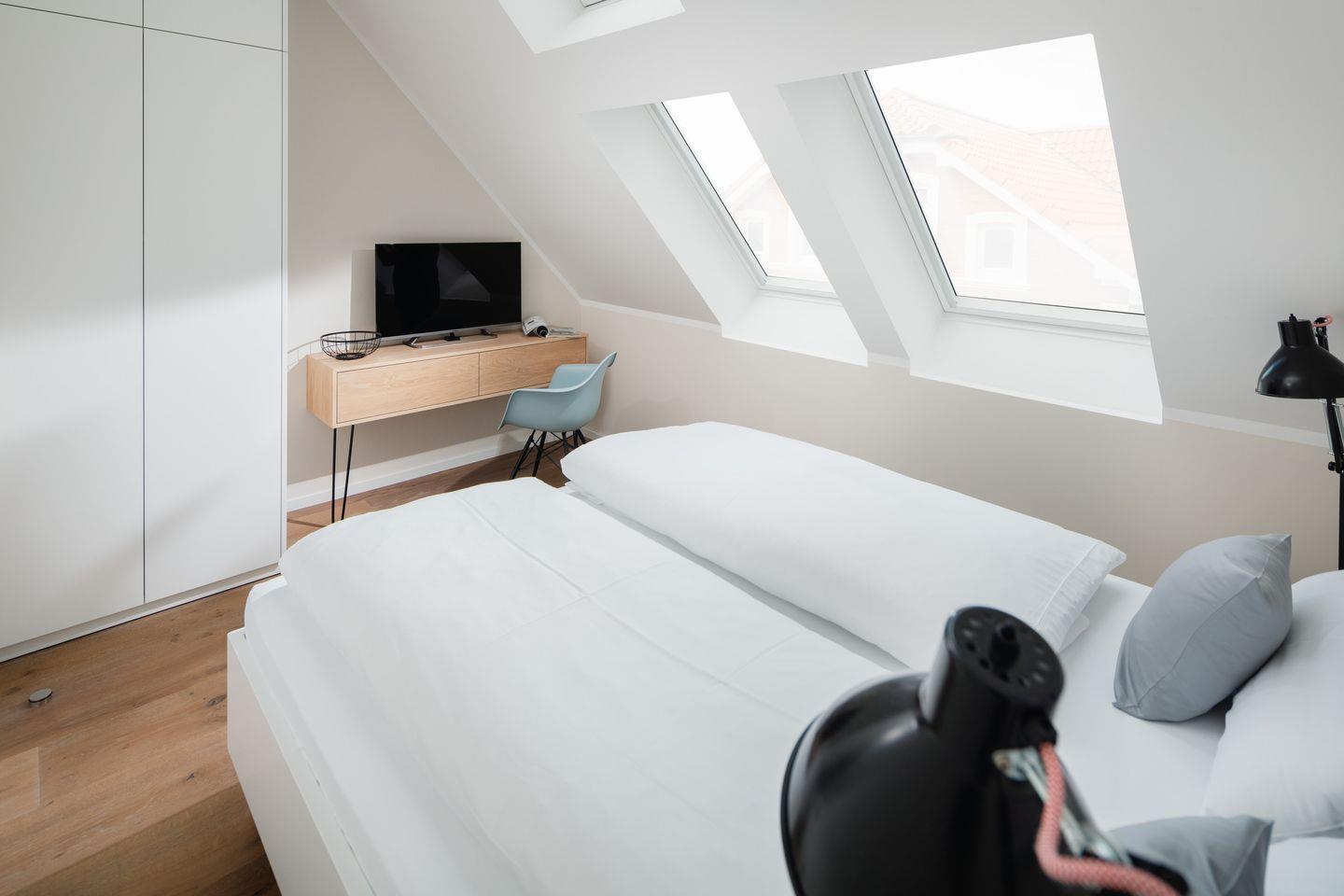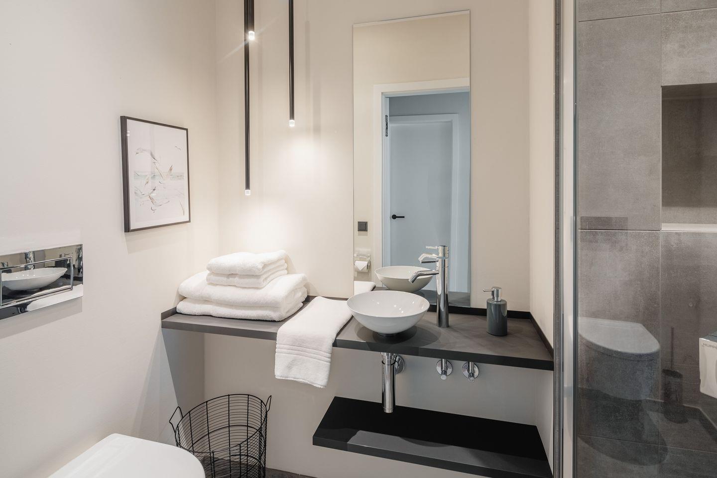 Die knapp 100 qm große Wohnung verfügt über zwei geräumige Schlafzimmer mit Doppelbetten und über zwei Badezimmer. Eines davon ist äußerst großzügig und lädt in Kombination mit einer Infrarot-Sauna zu erholsamen Wellnessstunden ein. In der offenen Wohnküche mit hochwertigsten, maßgefertigten Einrichtungen, empfängt Sie eine große Tafel für gesellige Stunden mit der Familie und Freunden.
