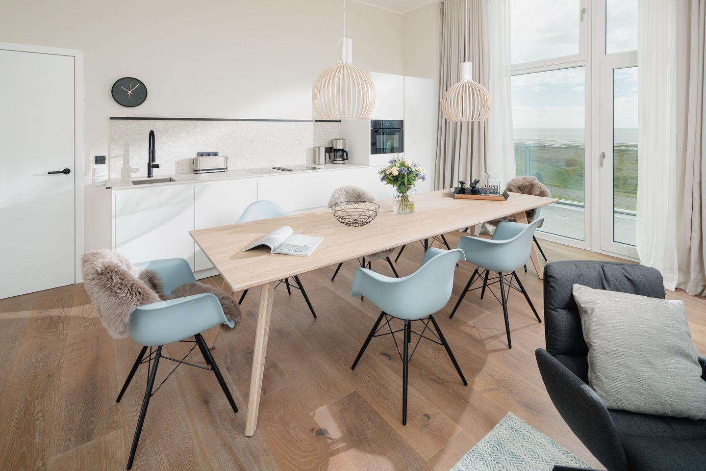 Das meer.loft.juist 9 bietet auf 100 m² modernen Komfort mit zwei Schlafzimmern, zwei Bädern, offener Küche und großzügigem Wohnbereich. Der Balkon mit Meerblick, Fußbodenheizung, Infrarotkabine und Kaminofen sorgen für entspannte Atmosphäre. Für anspruchsvolle Gäste stehen WLAN, drei TVs, Waschmaschine, Trockner sowie hochwertiges Interieur bereit. Strand und Einkaufsmöglichkeiten sind fußläufig erreichbar.