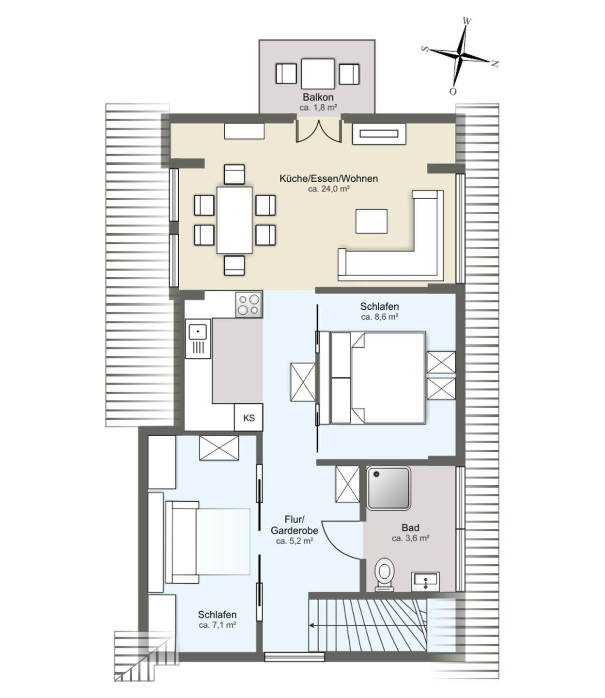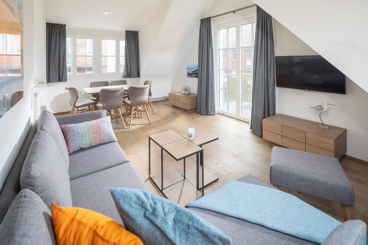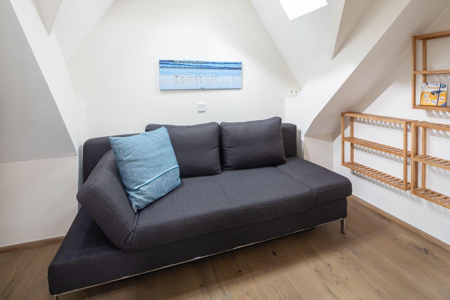 Durch großzügige Fensterfronten zu allen Himmelsrichtungen können Sie jederzeit einen Blick in die Dünen oder zum Wattenmeer genießen, sei es beim ersten Kaffee im Bett, beim ausgiebigen Frühstück oder beim Entspannen in der gemütlichen Sofaecke. Auf dem einladenden Süd-West-Balkon können Sie Ihren Tag am Meer genussvoll ausklingen lassen.