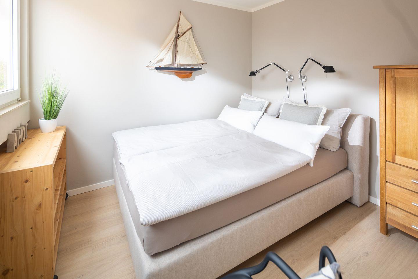 Die in zwei Etagen gegliederte Unterkunft umfasst insgesamt drei Zimmer, darunter zwei separate Schlafzimmer ( 1 SZ mit Doppelbett, ein SZ mit 2 Einzelbetten ), die sich für Familien oder gemeinsam reisende Paare eignen. Im offen gehaltenen Wohn- und Essbereich sorgen eine Sofaecke mit TV sowie WLAN für angenehme Unterhaltung und Konnektivität. Dabei bleibt genügend Platz, sich am Esstisch gemeinsam zu den Mahlzeiten zu treffen.
