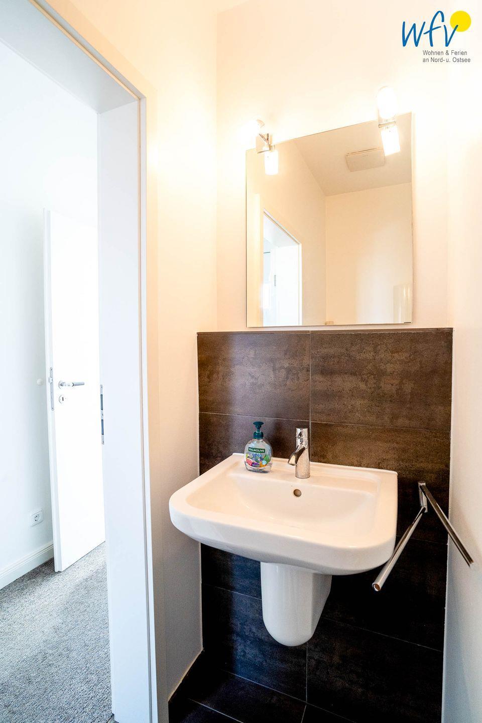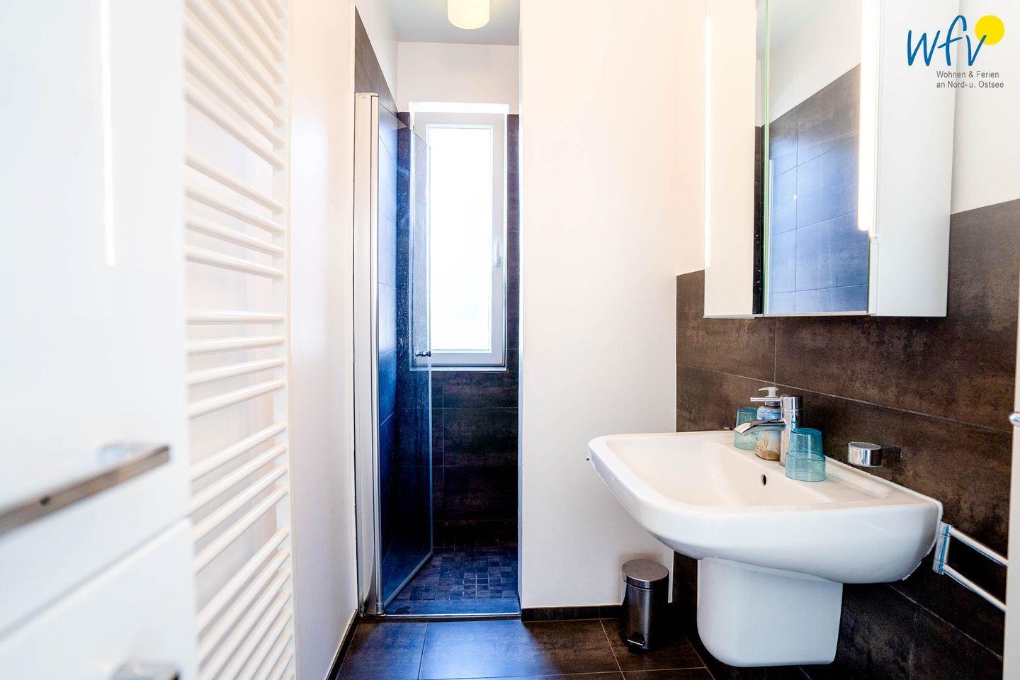 Das moderne Badezimmer mit bodengleicher Dusche, Handtuchheizung, Haartrockner und beleuchtetem Spiegel sorgt für weiteren Wohnkomfort. Das WC befindet sich in einem separaten Gäste-Bad.