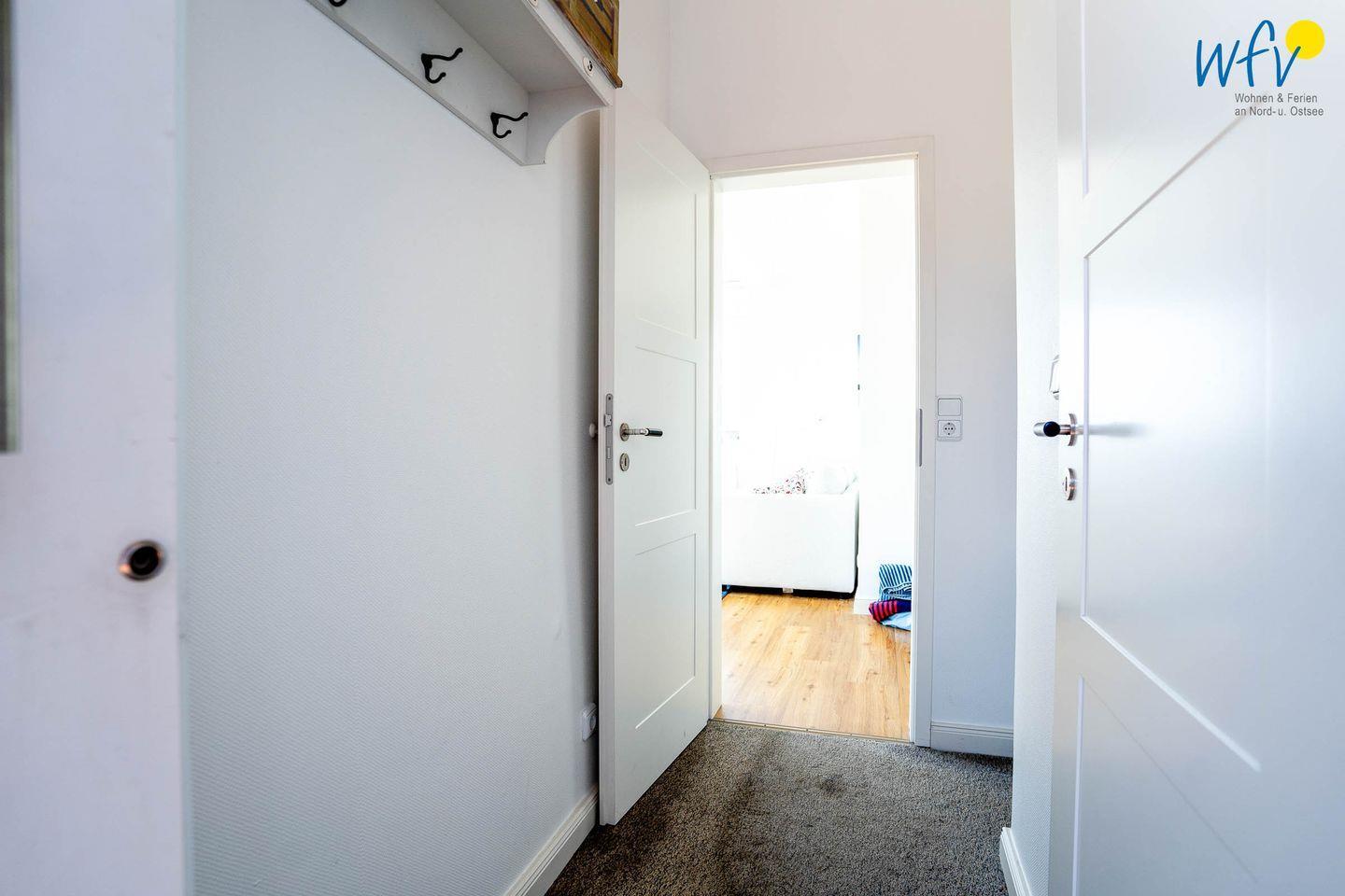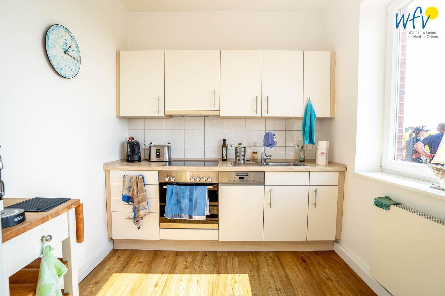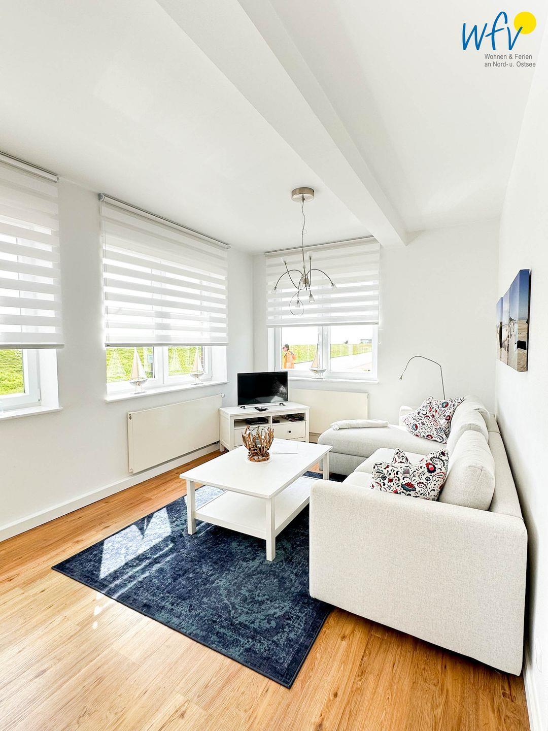 Es erwartet Sie ein heller Wohnraum mit breiter Fensterfront und schönem Lichteinfall. Modernes Mobiliar wie eine Couchecke und ein Esstisch mit Blick in die Umgebung lädt zum Entspannen ein, hübsche maritime Accessoires verleihen Ihrem Urlaub am Meer die entsprechende Nordseenote. In der Couchecke mit TV und DVD-Player können Sie gemütlich fernsehen oder Ihre Lieblingsfilme schauen. Zum Surfen vom Smartphone aus empfangen Sie kostenlos freies WLAN.