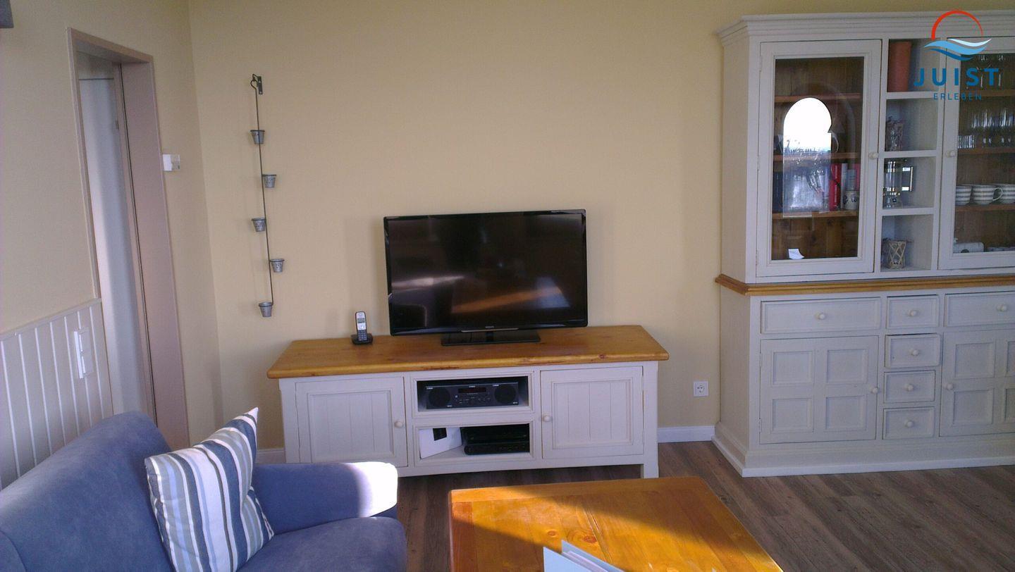 Eine gemütliche Couchecke und ein Essbereich runden den Raum ab. Zur Unterhaltung stehen Spiele, eine Musikanlage, ein DVD-Player mit einer Auswahl an DVDs sowie zwei Fernseher – einer im Wohnzimmer und einer im Schlafzimmer – bereit.